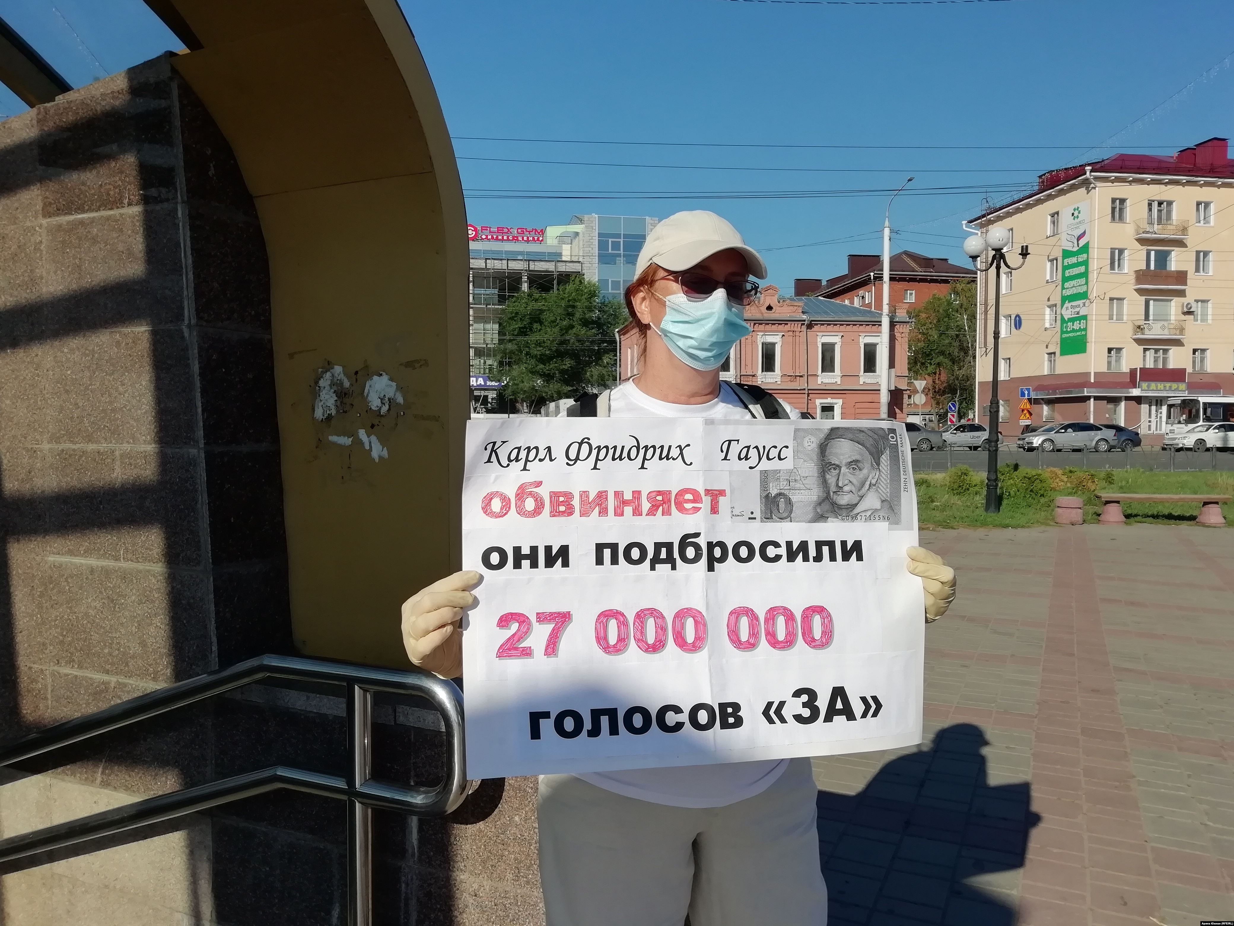 Пикетчица Елена Рубан, математик по образованию, с 2018 года наблюдает за выборами "с точки зрения математической статистики". Прошедшее голосование по поправкам к Конституции РФ она называет беспрецедентным по масштабу фальсификаций. "Первоначально, когда Центризбирком РФ выложил ещё не все данные по голосованию, группа независимых экспертов, среди которых физик Сергей Шпилькин, оценили вброс "за" в 22 миллиона голосов. Когда официальные данные были опубликованы полностью, оценка выросла с 22 до 27 миллионов вброшенных бюллетеней. Центризбирком постарался так, что это вышло за всякие рамки. Причем это был именно вброс, без учёта административного давления и принуждения", - говорит Елена Рубан. Пикетчица считает, что если убрать эти 27 миллионов бюллетеней, то получится, что явка составила около 50% и голоса "за" и "против" разделились примерно поровну.