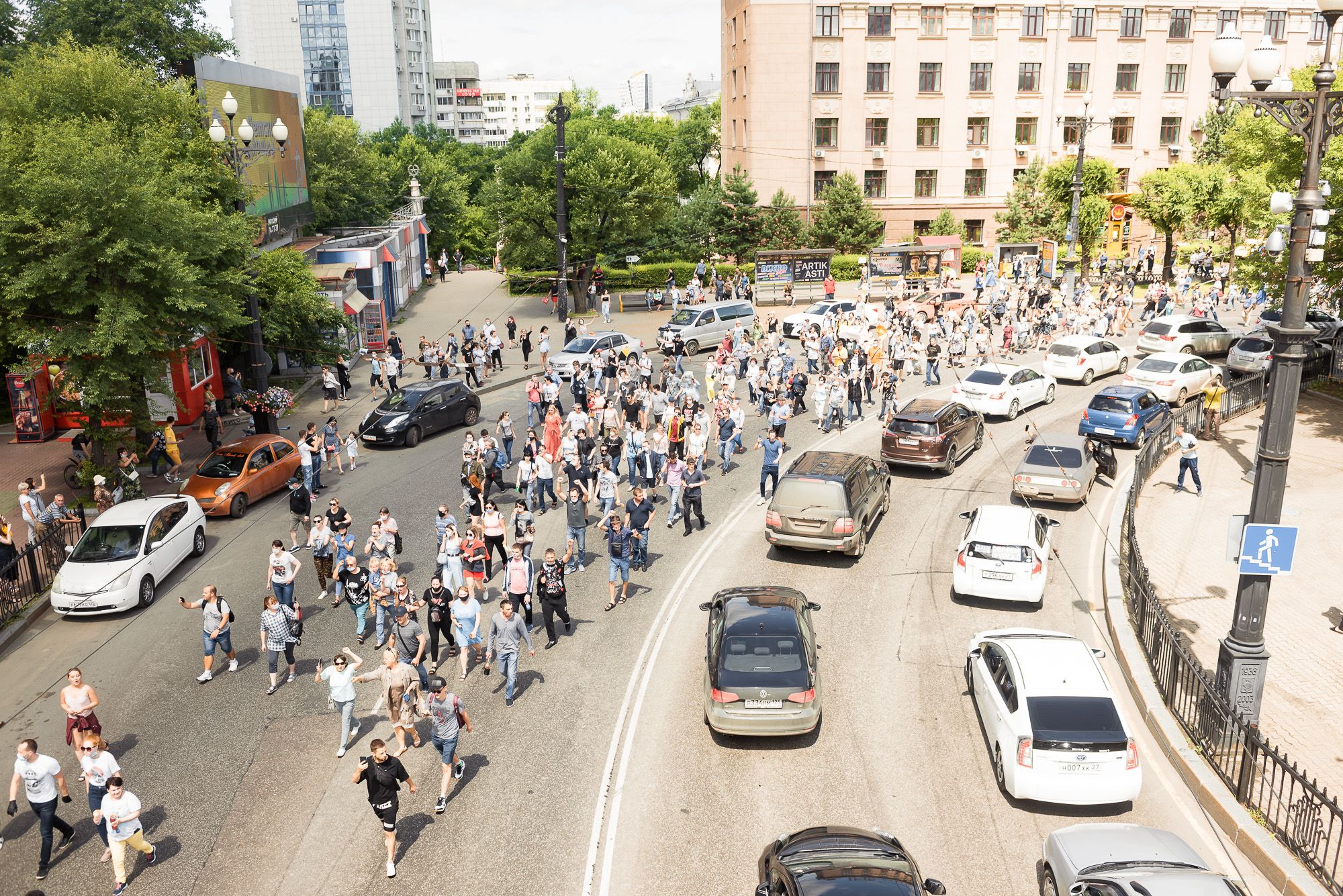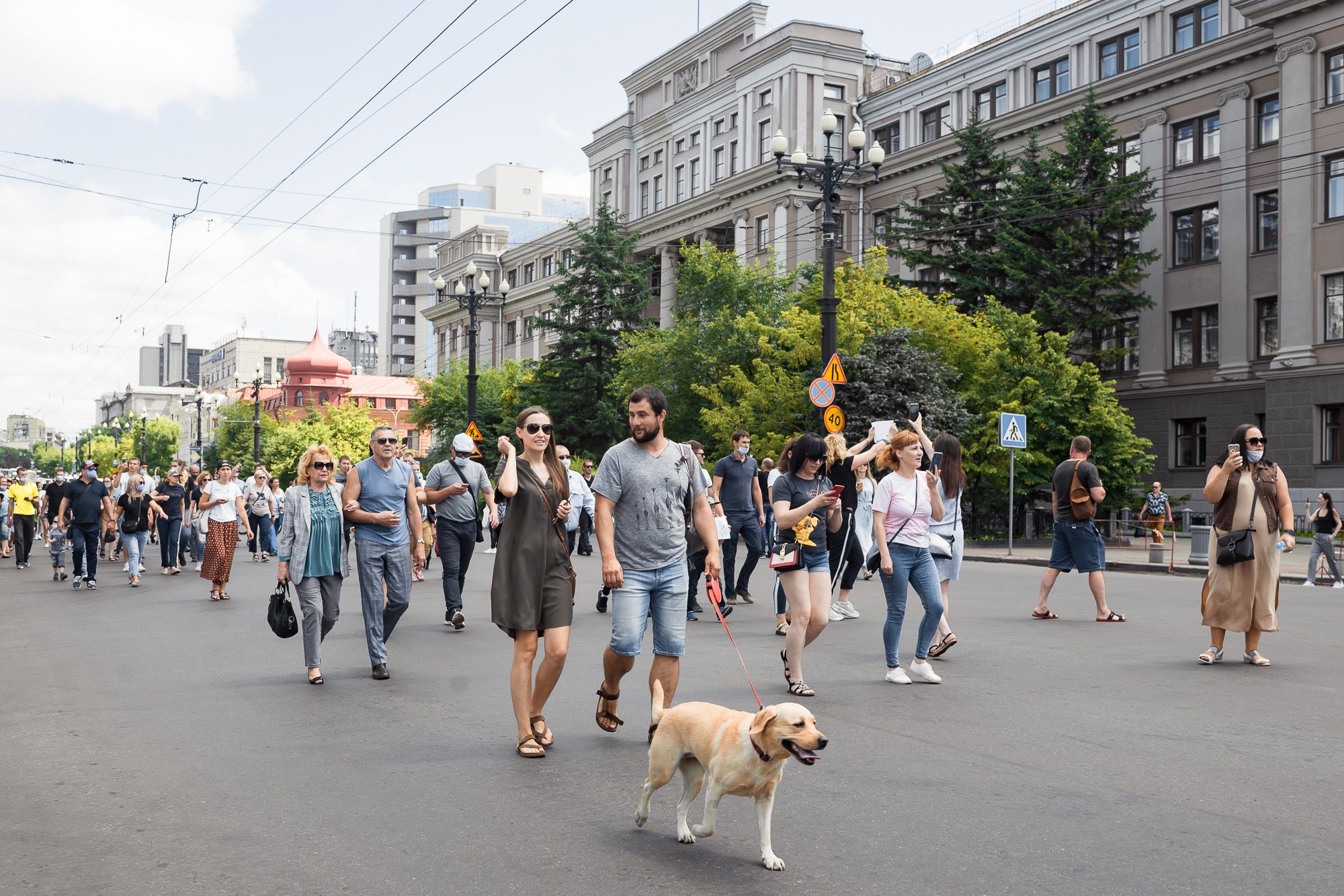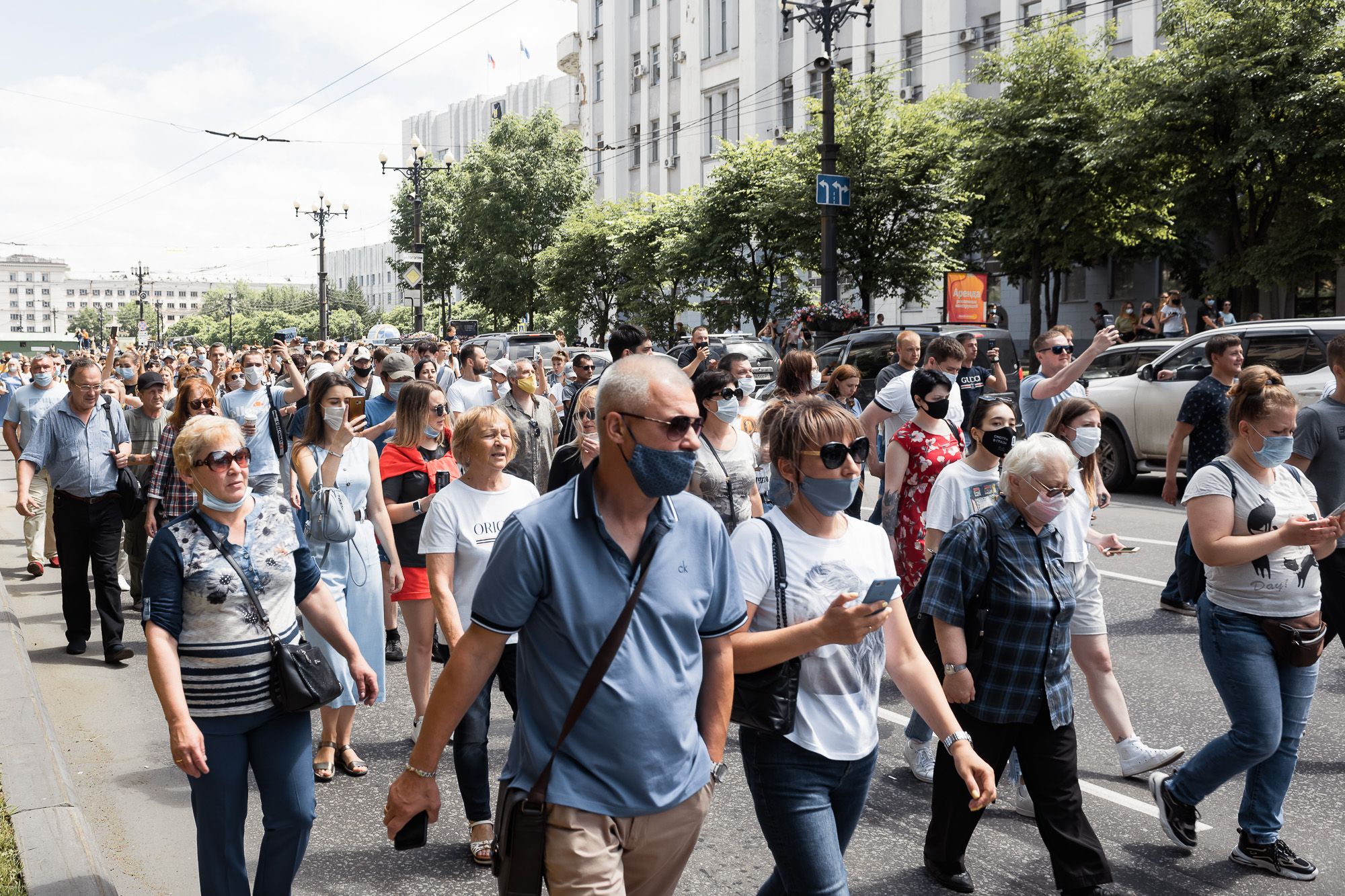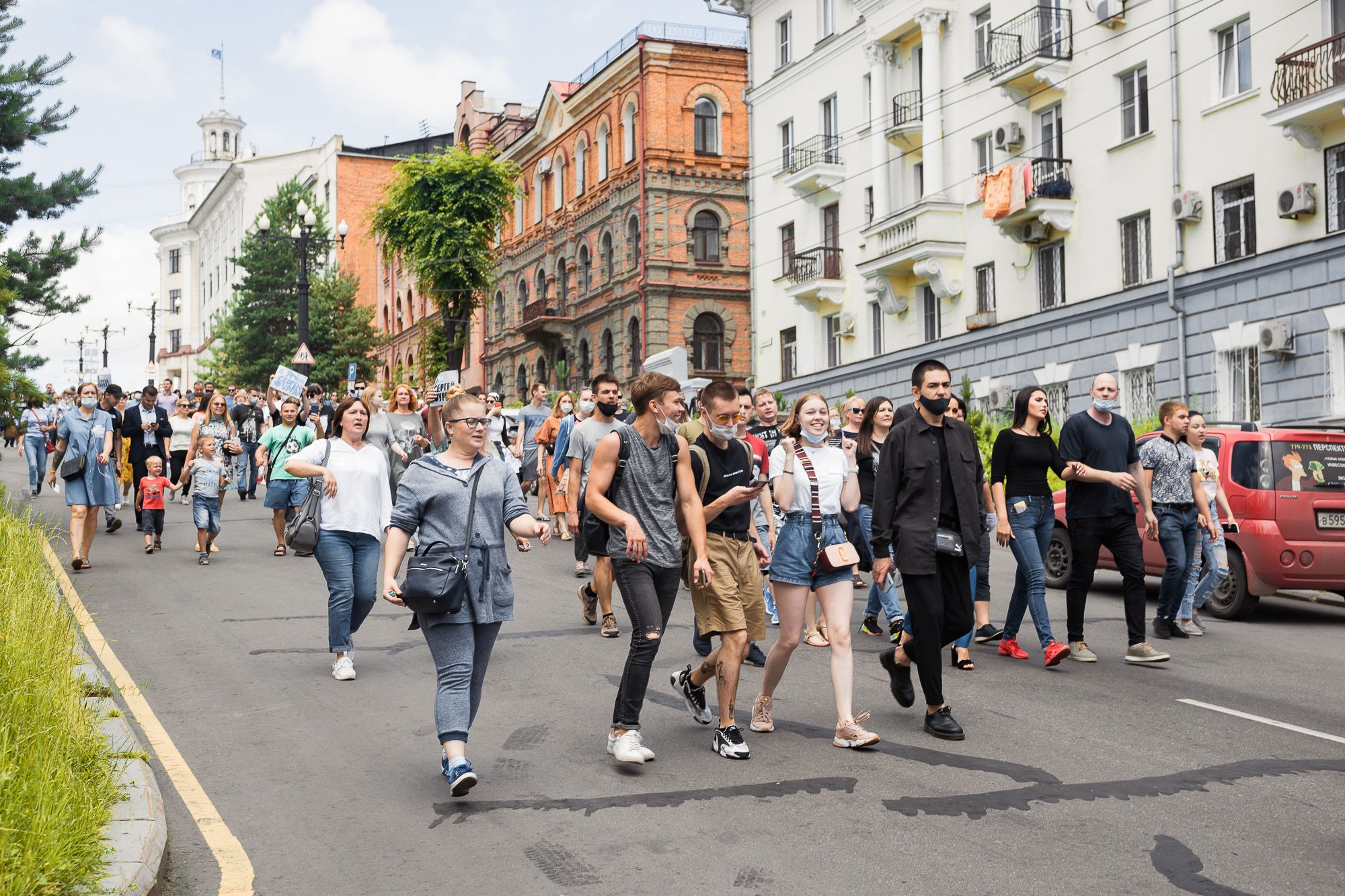Короновирусные ограничения действуют в Хабаровском крае как минимум до 27 июля. Но ни они, ни съехавшиеся к месту митинга автозаки и наряды полиции протестующих не остановили. По ходу движения к ним присоединялись все новые и новые участники – в общей сложности в акции приняли участие как минимум 10 тысяч человек (по некоторым оценкам, в несколько раз больше). Пройдя через площадь Ленина, люди двинулись прямо по проезжей части улиц Карла Маркса и Муравьева-Амурского до Комсомольской площади. Оттуда – до Уссурийского бульвара, площади Славы, а затем по ул. Ленина снова до исходной точки, к зданию регионального правительства. В колонне были люди всех возрастов, включая стариков и родителей с колясками.
