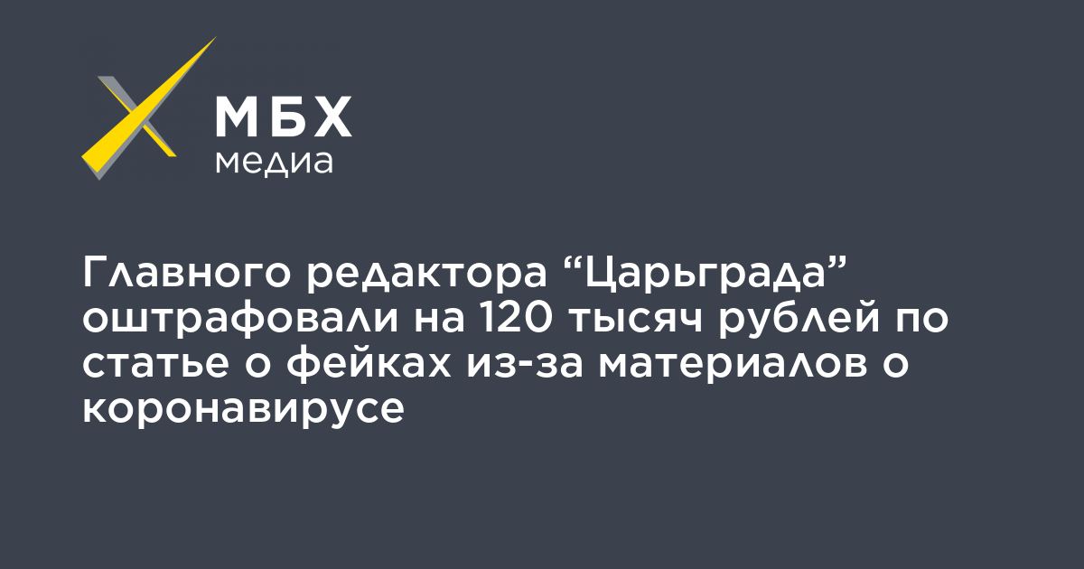 Главного редактора «Царьграда» оштрафовали на 120 тысяч рублей по статье о фейках из-за материалов о коронавирусе