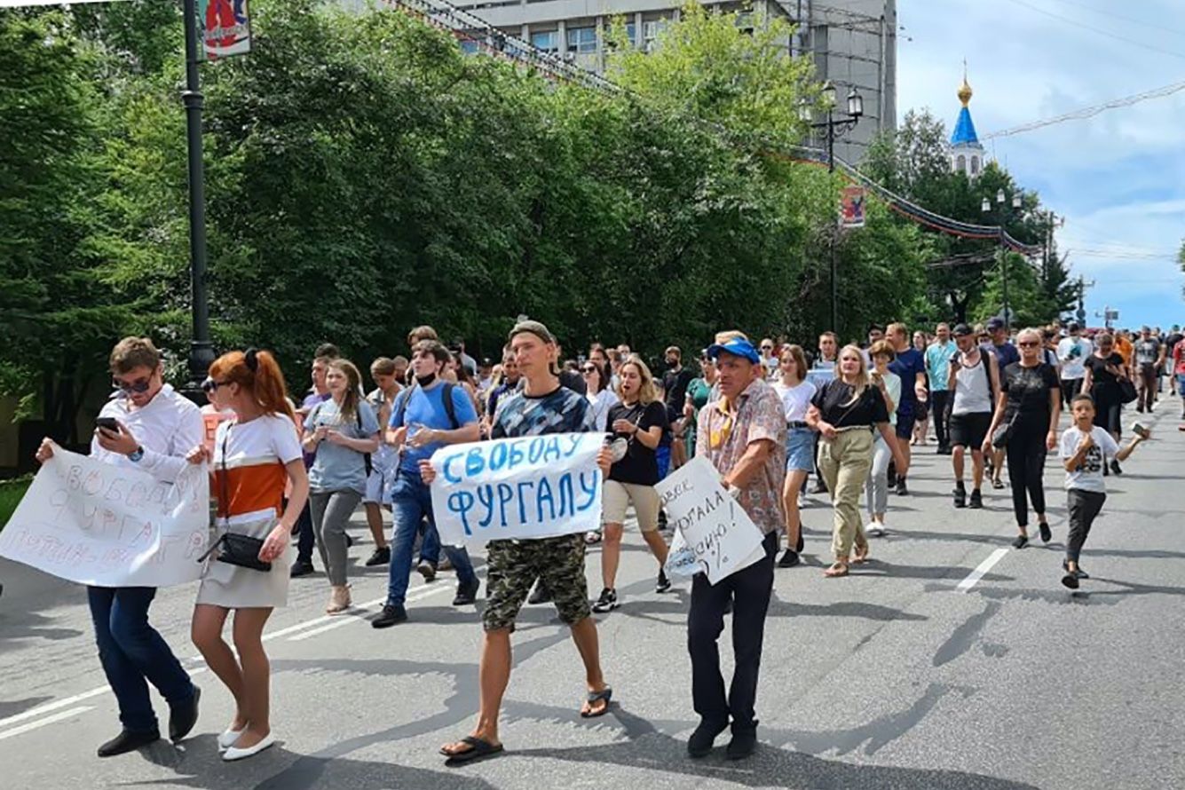 Обновление: Вечером 12 июля в Хабаровске началась новая акция в поддержку Сергея Фургала. В ней принимают участие несколько тысяч человек. Они прошли по центральным улицам города, скандируя: «Свободу», «Я/Мы Фургал» и «Фургала — домой».