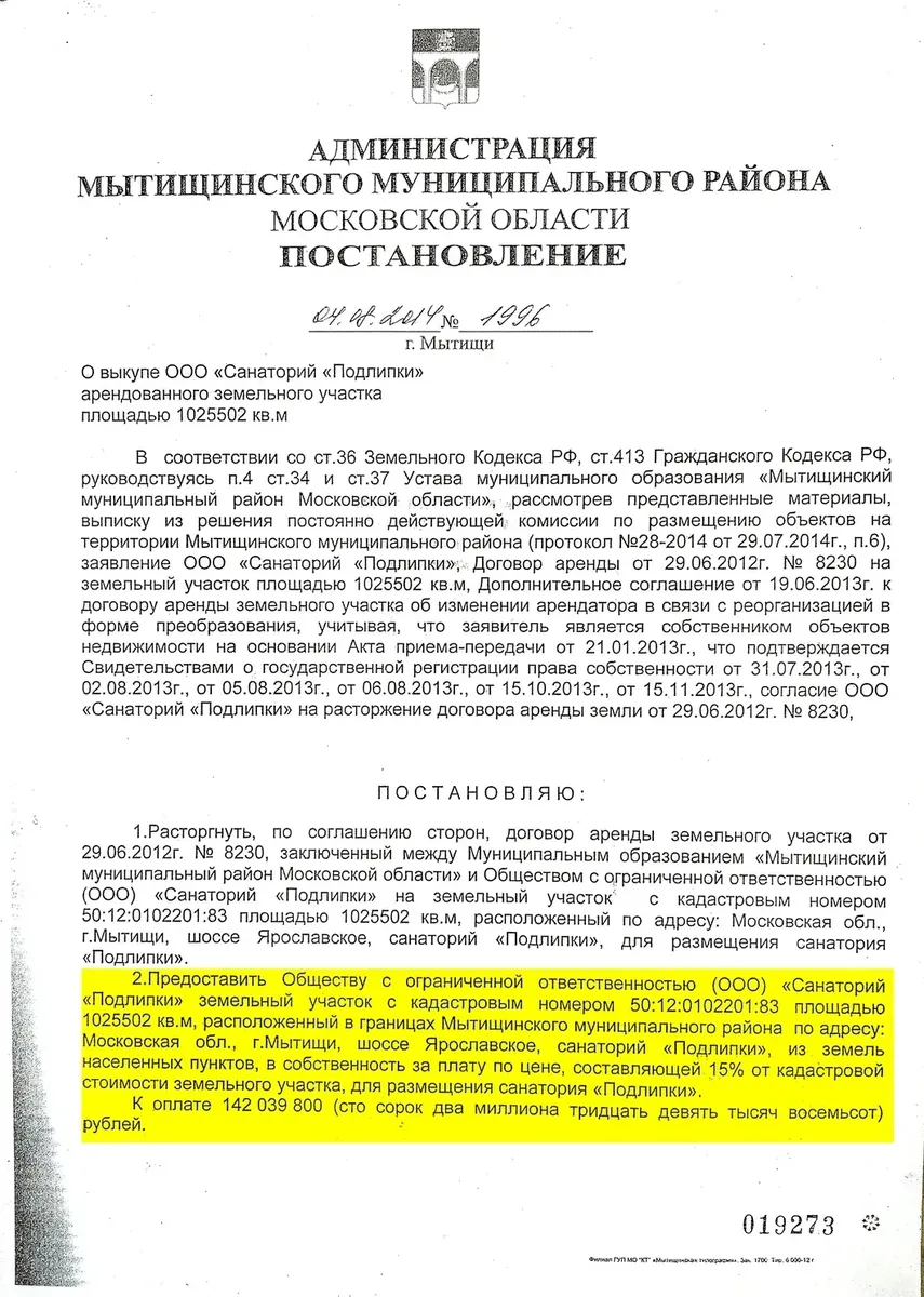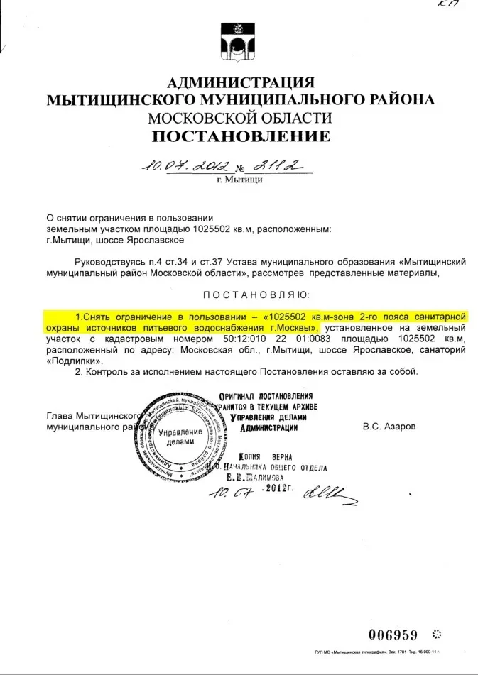Через 11 дней после этого глава Мытищинского района Виктор Азаров это ограничение снимает своим постановлением от 10 июля 2012 года № 2112. Лес больше не в санитарной зоне.