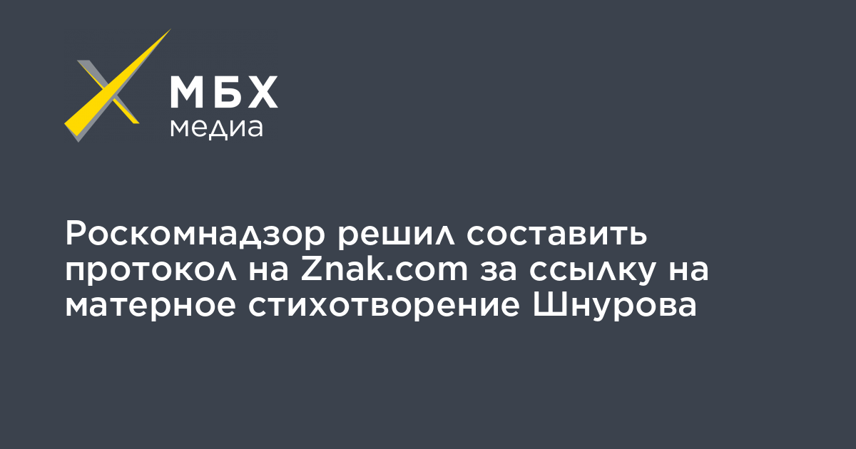 Роскомнадзор решил составить административный протокол на издание Znak.com за публикацию материала со ссылкой на пост певца и сопредседателя Партии роста Сергея Шнурова, в котором содержался мат. Об этом «МБХ медиа» сообщил шеф-редактор издания Дмитрий Колезев.