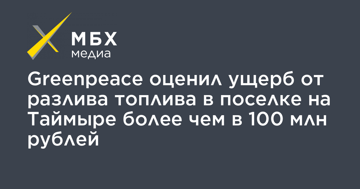 Экологический ущерб от разлива топлива в поселке Тухард Таймырского района Красноярского края может превышать 100 млн рублей. Об этом «МБХ медиа» сообщил проектный директор российского Greenpeace Владимир Чупров.
