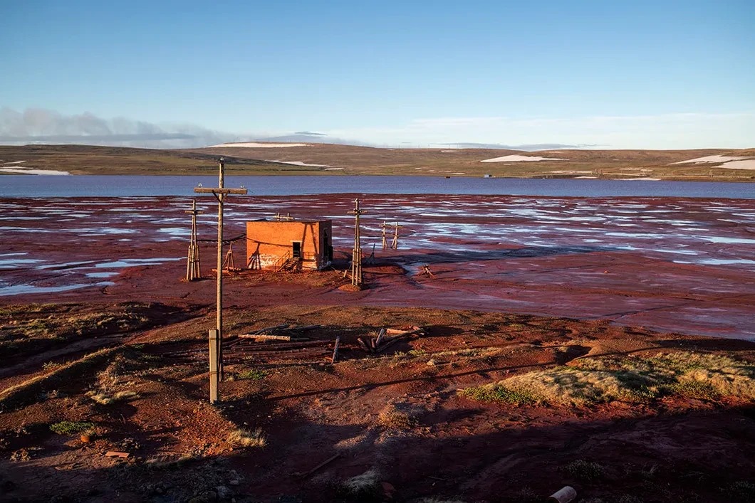 Рамиль прячет машину у трассы, мы с Игорем идем к Красному озеру — самому старому хвостохранилищу Надеждинского завода, «Надежды». Мы долго идем вдоль ржавых труб. Над трубами в полярный день горят новенькие фонари. Земля вокруг переворошена — после разлива топлива и перед визитами высоких лиц здесь убирали красные подтеки, перекапывали землю бульдозером.