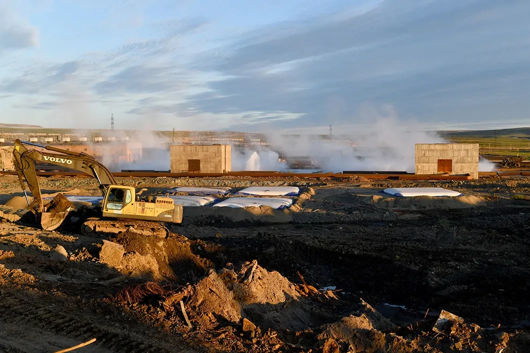 Земля пахнет и дымится. Экскаватор сгребает кучи в озеро с алыми берегами. Водитель вместо ответов похлопывает по спецовке «Норникеля» и улыбается.