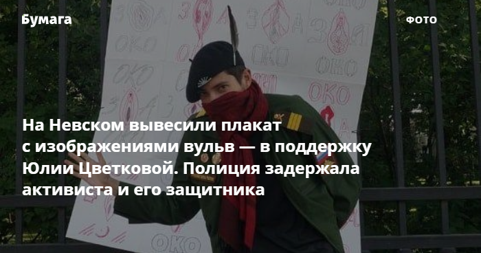 Вечером 14 июля петербургский активист Павел Крисевич вывесил на Невском проспекте плакат с изображениями вульв в поддержку ЛГБТ-активистки Юлии Цветковой. После этого полиция задержала его, а позже — его общественного защитника, пишет «ОВД-Инфо».