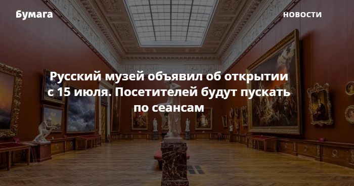 Русский музей сообщил о поэтапном открытии с 15 июля. С этого дня для посетителей откроют Михайловский дворец и корпус Бенуа. С 29 июля для зрителей заработают Михайловский замок, Строгановский и Мраморный дворцы.