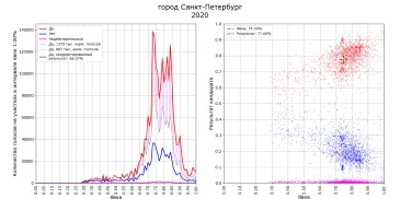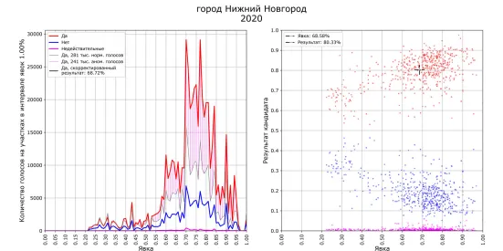 В Санкт-Петербурге и Нижнем Новгороде на том месте, где в предыдущих городах было ядро кометы, осталось лишь по несколько десятков участков, а большая их часть переехала в район явки 75% и результата >80%. Как такое могло произойти естественным образом — непонятно. Чем Санкт-Петербург так отличается от Москвы и Нижний Новгород — от Екатеринбурга или Новосибирска? Неужели концентрации «отщепенцев» и «глубинного народа» настолько различны в двух столицах и в двух городах-миллионниках? Причем в Нижнем Новгороде и Санкт-Петербурге немногочисленные «отщепенцы» еще и не смешиваются с «глубинным народом», а группируются на конкретных избирательных участках, где голосование происходит как в московском, новосибирском или екатеринбургском ядре. Напомним, что речь идет не о заводских поселках, где избирательный участок может состоять из работников одного предприятия, а о миллионных городах.