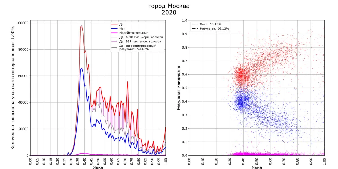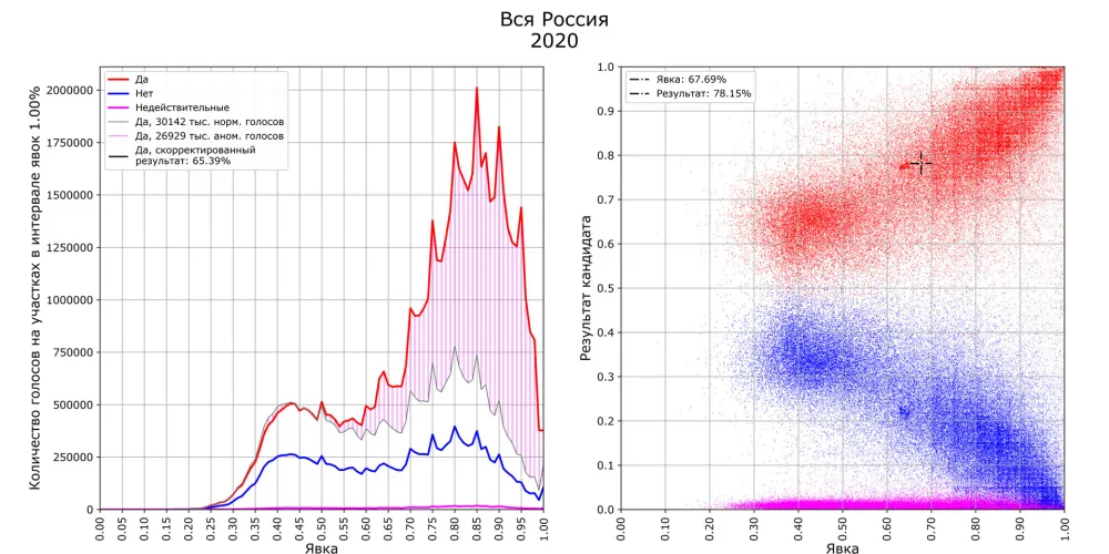 Рис. 1. Справа: процент «Да» и «Нет» на избирательных участках в зависимости от явки на каждом участке. Крестиком отмечены официальные значения явки и результата, рассчитанные без учета двух «участков» электронного голосования в Москве и Нижегородской области, которые на диаграмме не показаны из-за своих гигантских размеров.