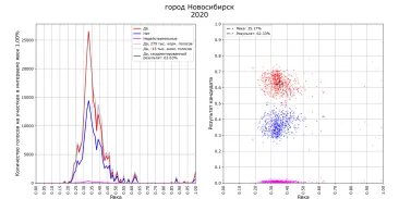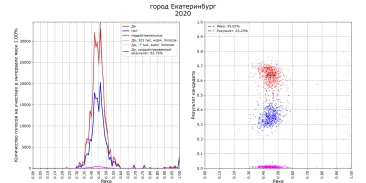 Самая ясная и понятная картина — в Екатеринбурге и Новосибирске. Хвост кометы отсутствует, есть только ядро — на немного разных явках (45% и 35% соответственно), но примерно одном и том же результате «Да» — около 62–63%. Распределение голосов по явке в левой панели выглядит как простой симметричный «колокол» (с объяснимыми статистическими флуктуациями).