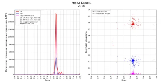Один из возможных ответов — эти числа ненастоящие. Косвенным подтверждением этому могут служить два (всего два!) избирательных участка — № 259 и № 260 Ново-Савиновского района Казани, где наблюдателям из Ассоциации наблюдателей Татарстана удалось полностью проконтролировать процесс голосования. Явка на них составила лишь немногим больше 30%, а результат «Да» на одном чуть выше 50%, а на другом — около 45%, и эти две пары точек легко найти на правой диаграмме. «Кучность» же остальных казанских результатов столь велика, что их видно на общероссийском графике — обратите внимание на красное пятно немного левее и чуть ниже отмеченного крестиком официального результата на рис. 1.