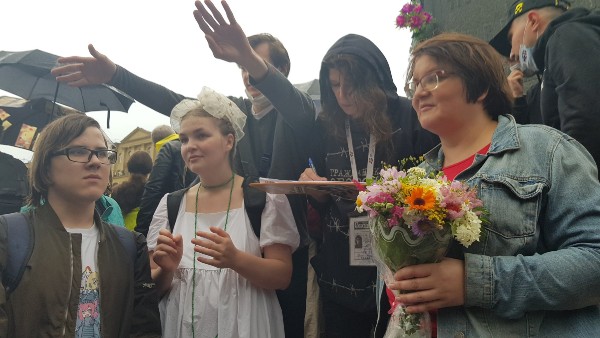 Как сообщает Sota.Vision, на краю площади на ЛГБТ-активистов напали провокаторы и отобрали у них радужный флаг.