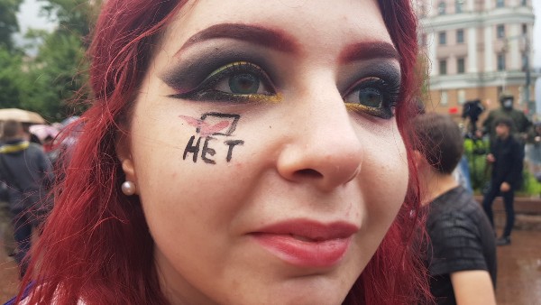 Демонстранты скандировали "Путин - вор", "Свободу политзаключенным", "Москва, выходи", "Нет поправкам", "Хабаровск, мы с тобой", "Свободу Сергею Фургалу".
