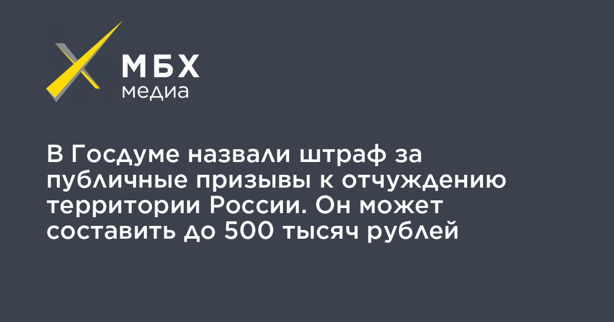 В среду в Госдуму внесен законопроект, согласно которому административный штраф за публичные призывы в СМИ и интернете к отчуждению территорий России может составить до 500 тысяч рублей, сообщает «РИА Новости».