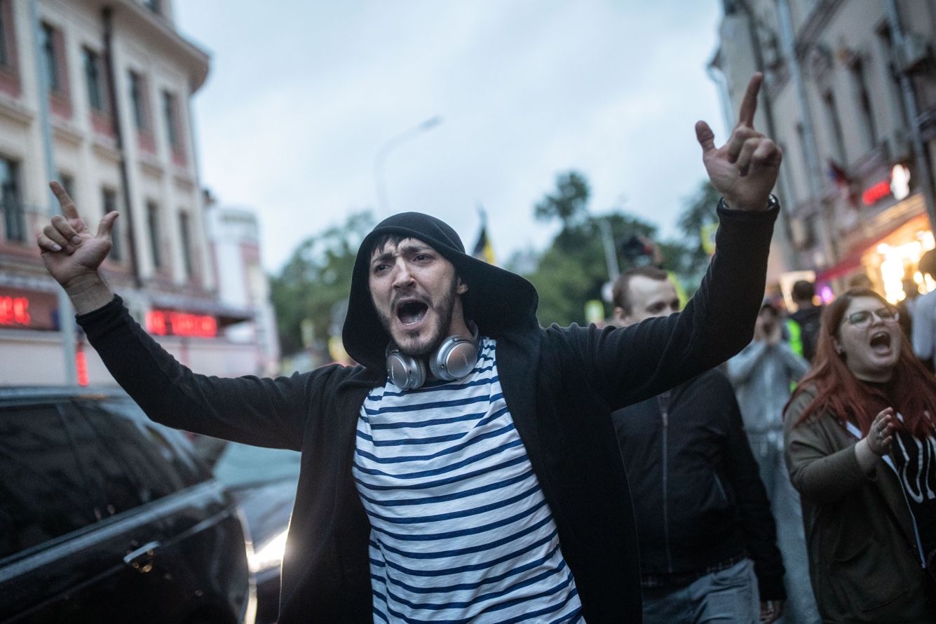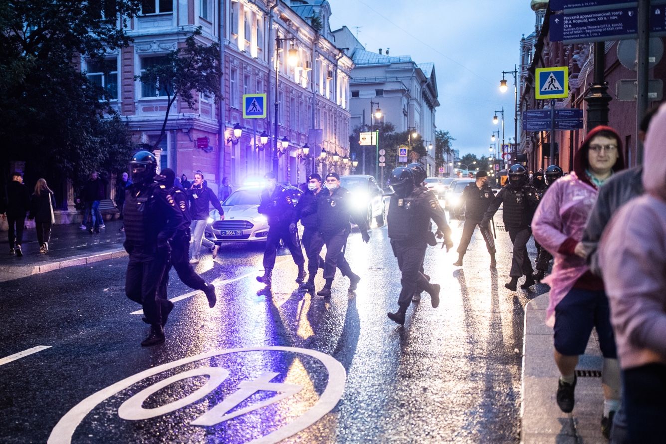 Омоновцы становятся в оцепление и перекрывают улицу, разбивая протестующих на несколько групп. Задержания продолжаются. Из толпы выхватывают случайных людей, в том числе журналистов. С разных сторон доносятся крики: «Полиция с народом» и «Позор», но задерживают и кричавших. Большинство задержанных ведут к автозаку «ласточкой» — с сильно заведенными за спину руками.