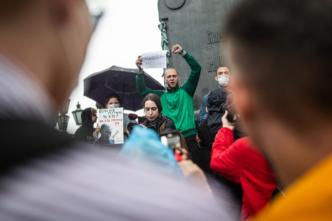 Грузный мужчина кричит: «Я следующий» — и, расталкивая толпу, идет к памятнику Пушкину на Тверской улице. Здесь собирают подписи за отмену итогов голосования по поправкам в Конституцию.