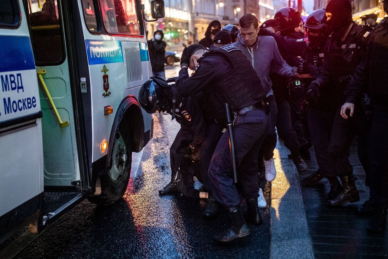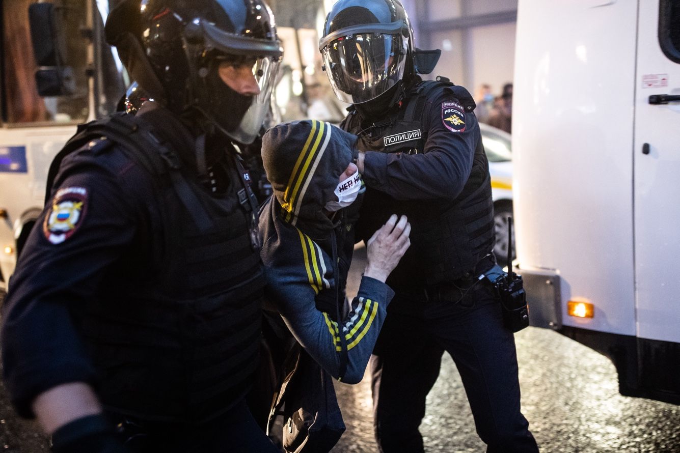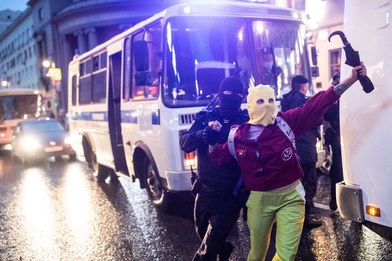 Звучат сирены. Автозаки вереницей въезжают в переулок. За протестующими бегут полицейские и омоновцы в полной защитной экипировке. На соседней Петровке начинаются жесткие задержания. Одного из участников шествия сотрудники окружают и бьют ногами. После чего заталкивают в машину. Другого протестующего во время задержания валят на землю и тащат к автозаку. Многих заносят в машину на руках.