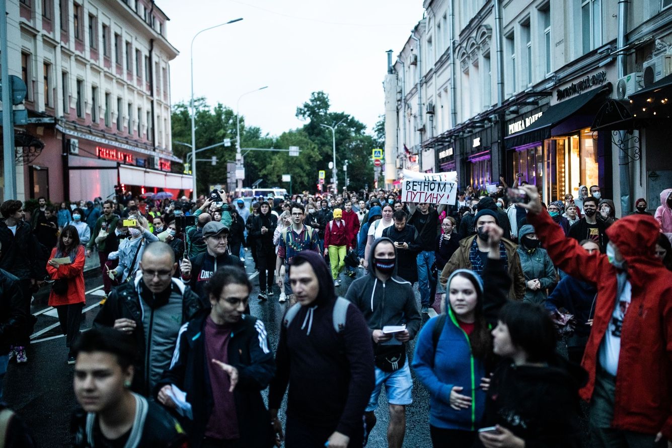 Слышны на Пушкинской и лозунги: «Россия будет свободной», «Раз, два, три — Путин, уходи», «Лучшая поправка — Путина отставка», «Свободу политзаключенным», «Мы здесь власть». Полицейские, которые во время пандемии задерживают москвичей даже за одиночные пикеты, в этот раз за происходящим наблюдают со стороны и почти не вмешиваются. О единственном задержанном на площади сообщила координатор «Открытой России» Татьяна Усманова. По ее словам, его вскоре отпустили.