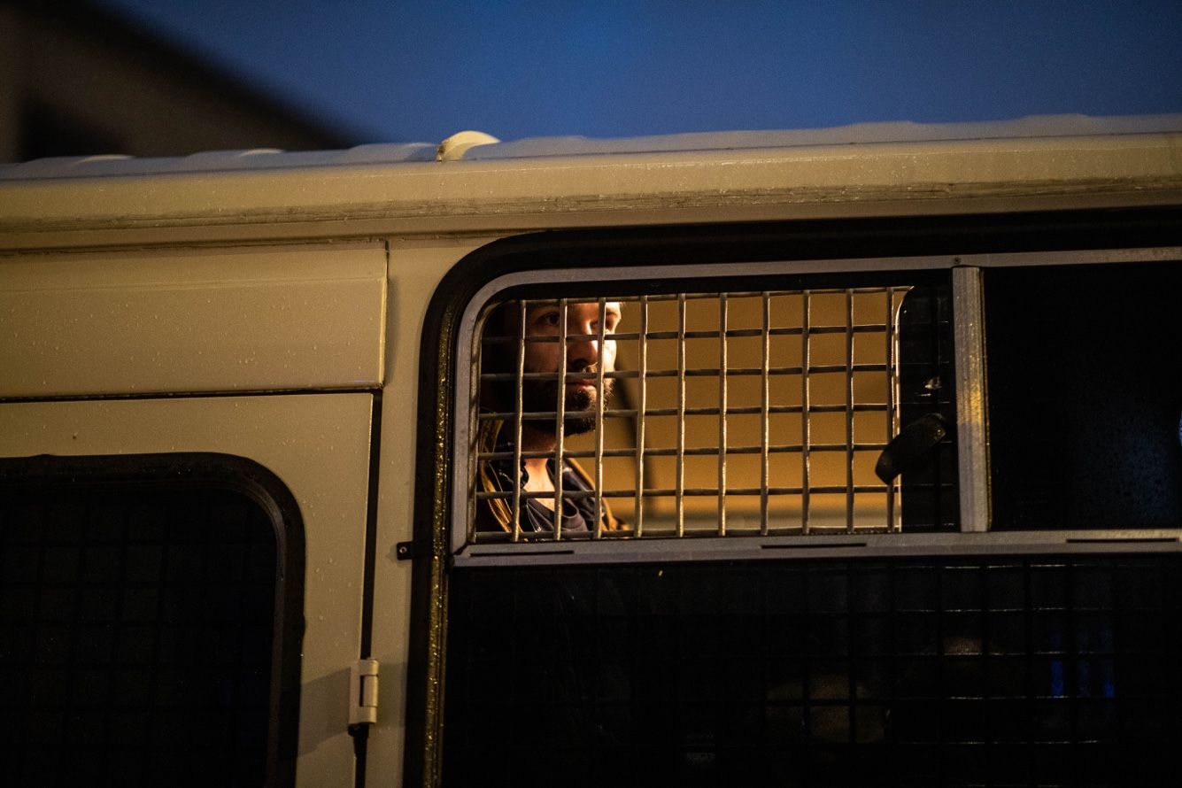 Когда на улице почти никого не остается, последние автозаки уезжают. В форточку автозака один из задержанных продолжает кричать: «Россия будет свободной».