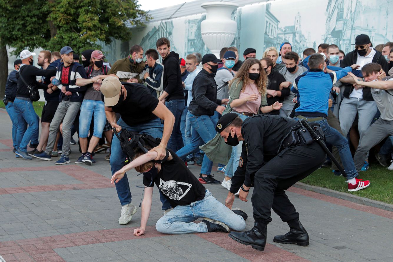 The demonstrations in Minsk began spontaneously around 7:00 p.m., and arrests started almost immediately, reported RFE/RL’s Belarusian service, Radio Svaboda. In Minsk, people took to the streets in different parts of the city. Hundreds of people came to the capital’s main street, Independence Avenue; many participants came to the demonstrations by bike. Passing cars honked their horns in solidarity with the protesters. Almost immediately, law-enforcement officials and plainclothes officers began arresting demonstrators, as well as journalists. In response, protesters began chanting “Shame” in both Russian and Belarusian.
