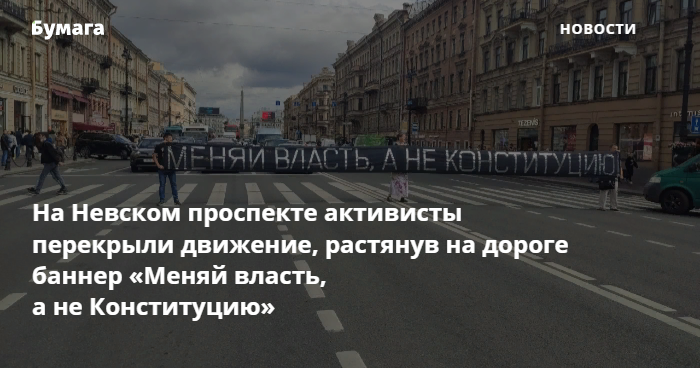 Несколько активистов растянули баннер «Меняй власть, а не Конституцию» поперек проезжей части Невского проспекта днем 16 июля. Фото и видео акции опубликовали телеграм-каналы «Объектив реалий» и «ЯГражданин».