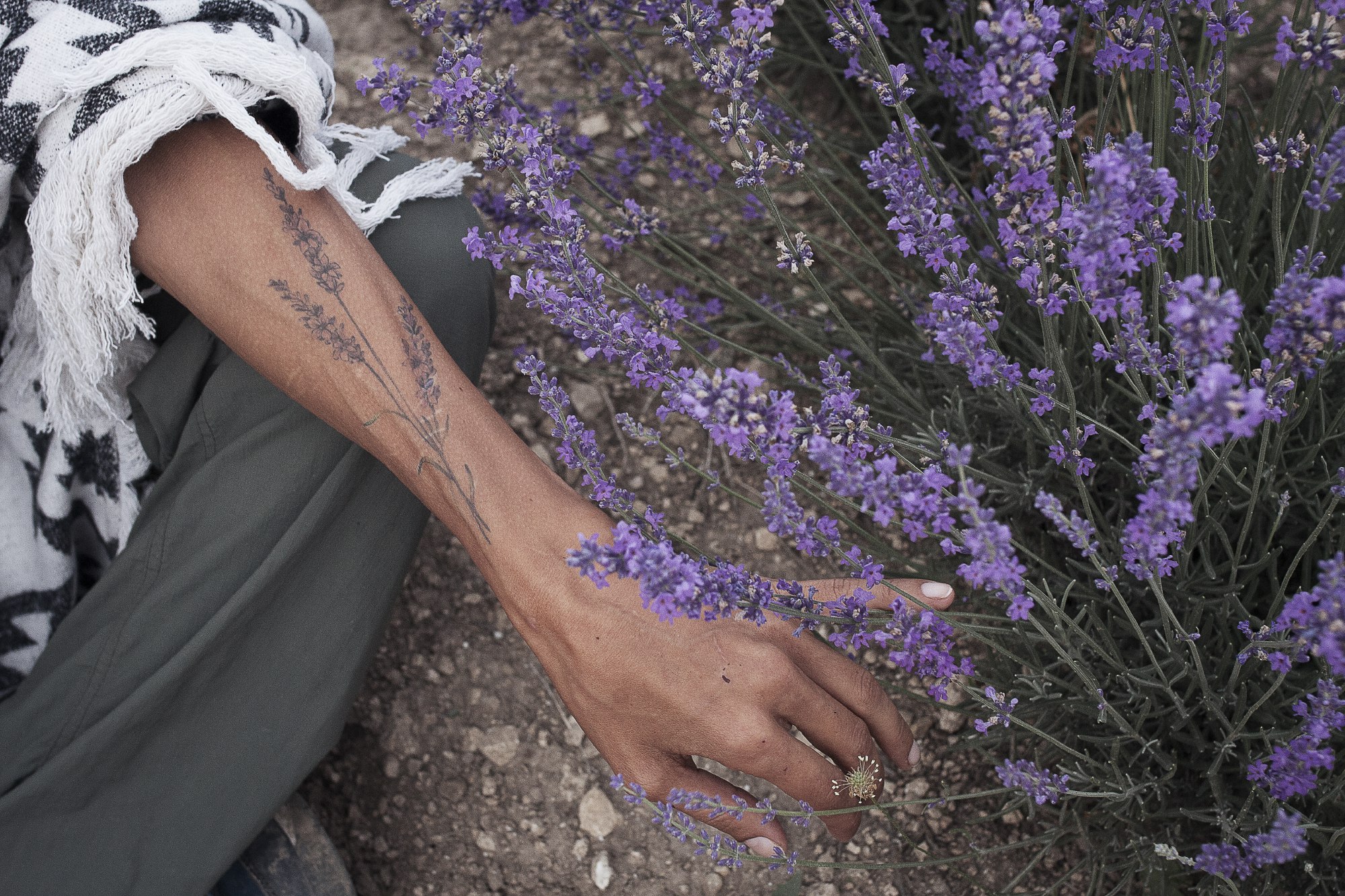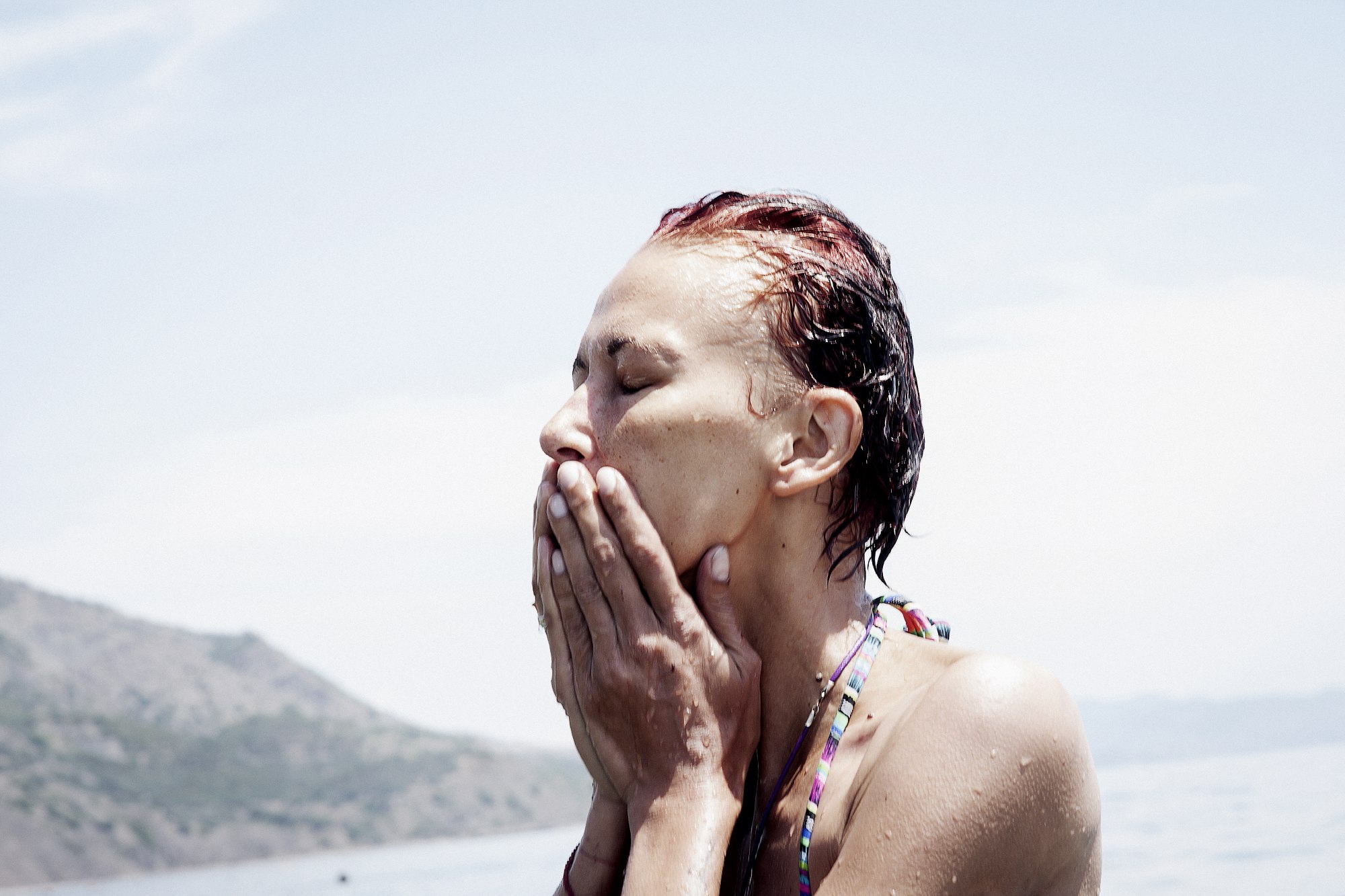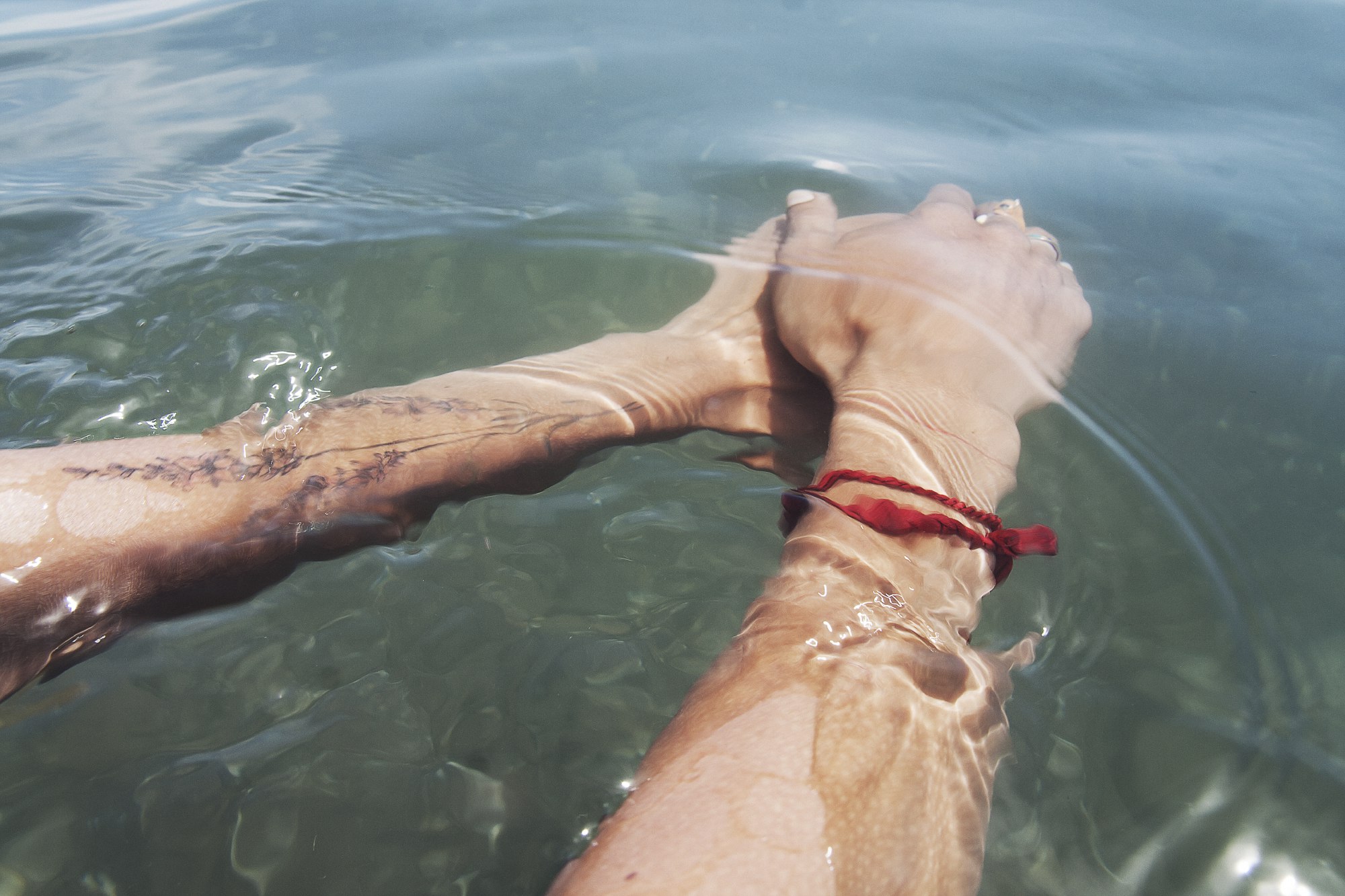Ира купается в море, на руке видна татуировка с веточкой лаванды, которую она сделала еще зимой, надеясь летом увидеть лаванду вживую