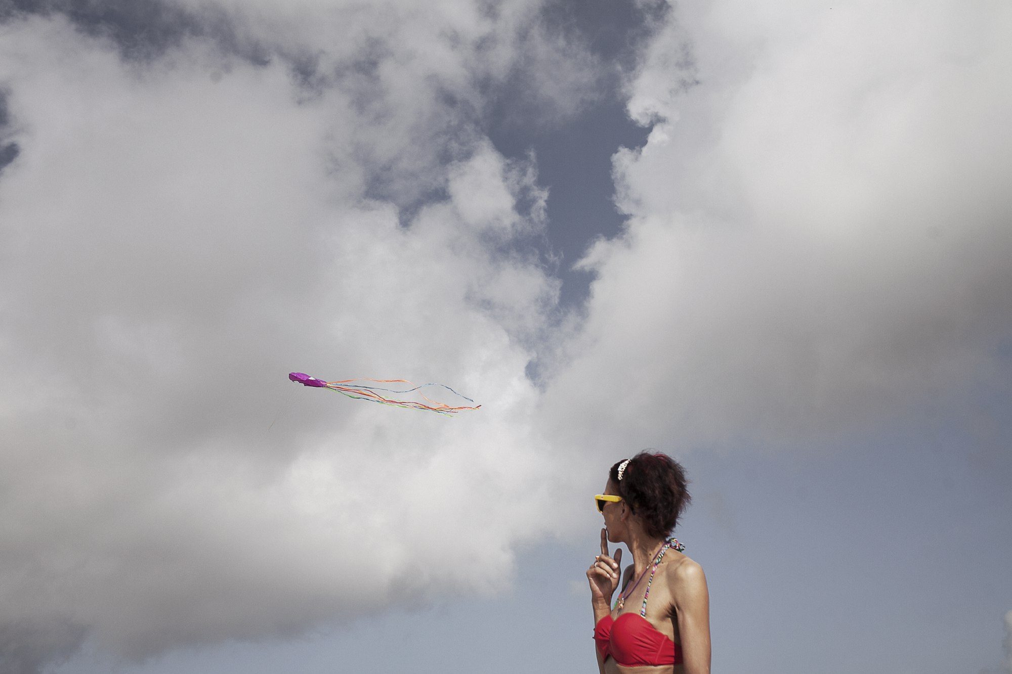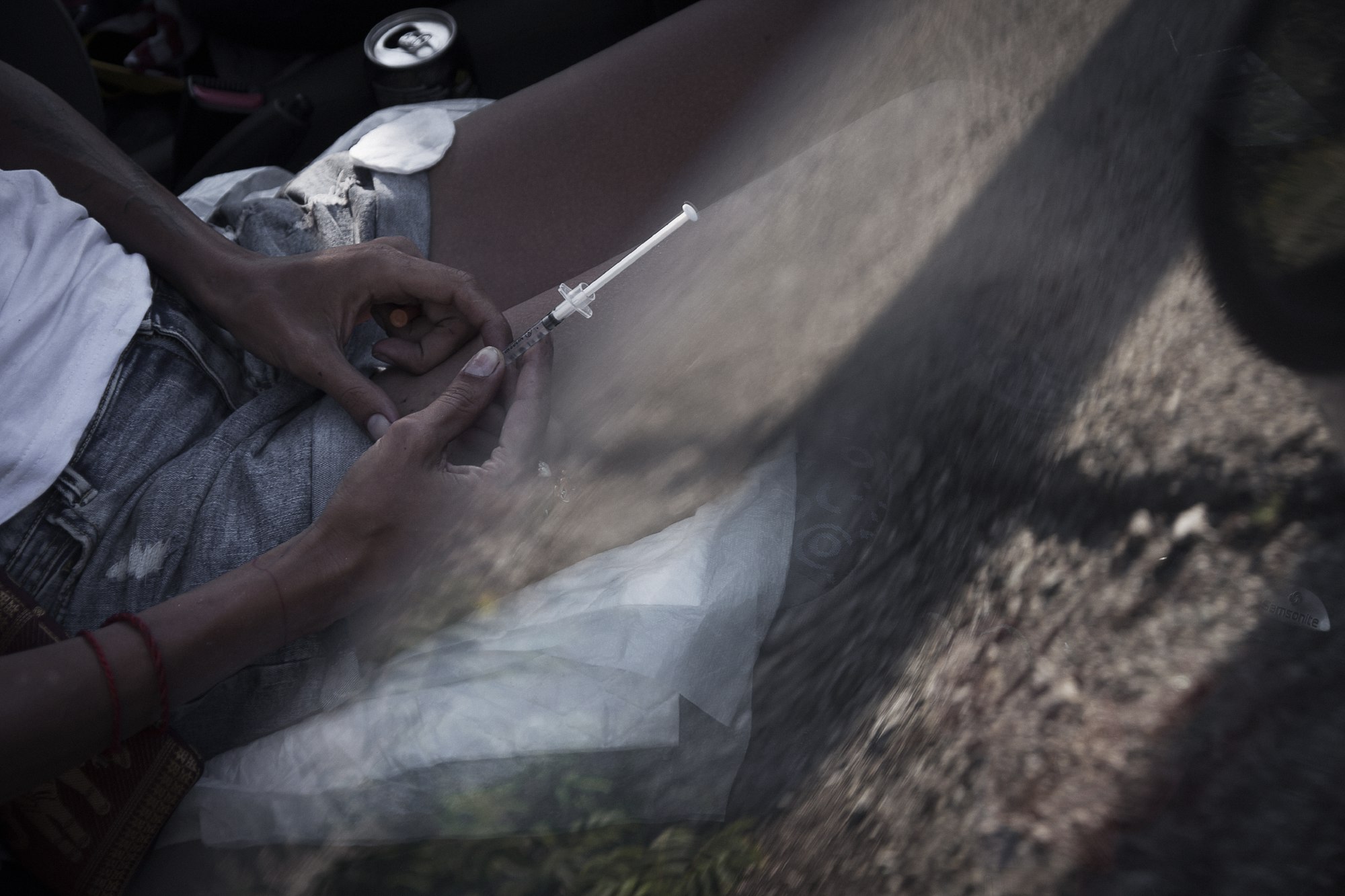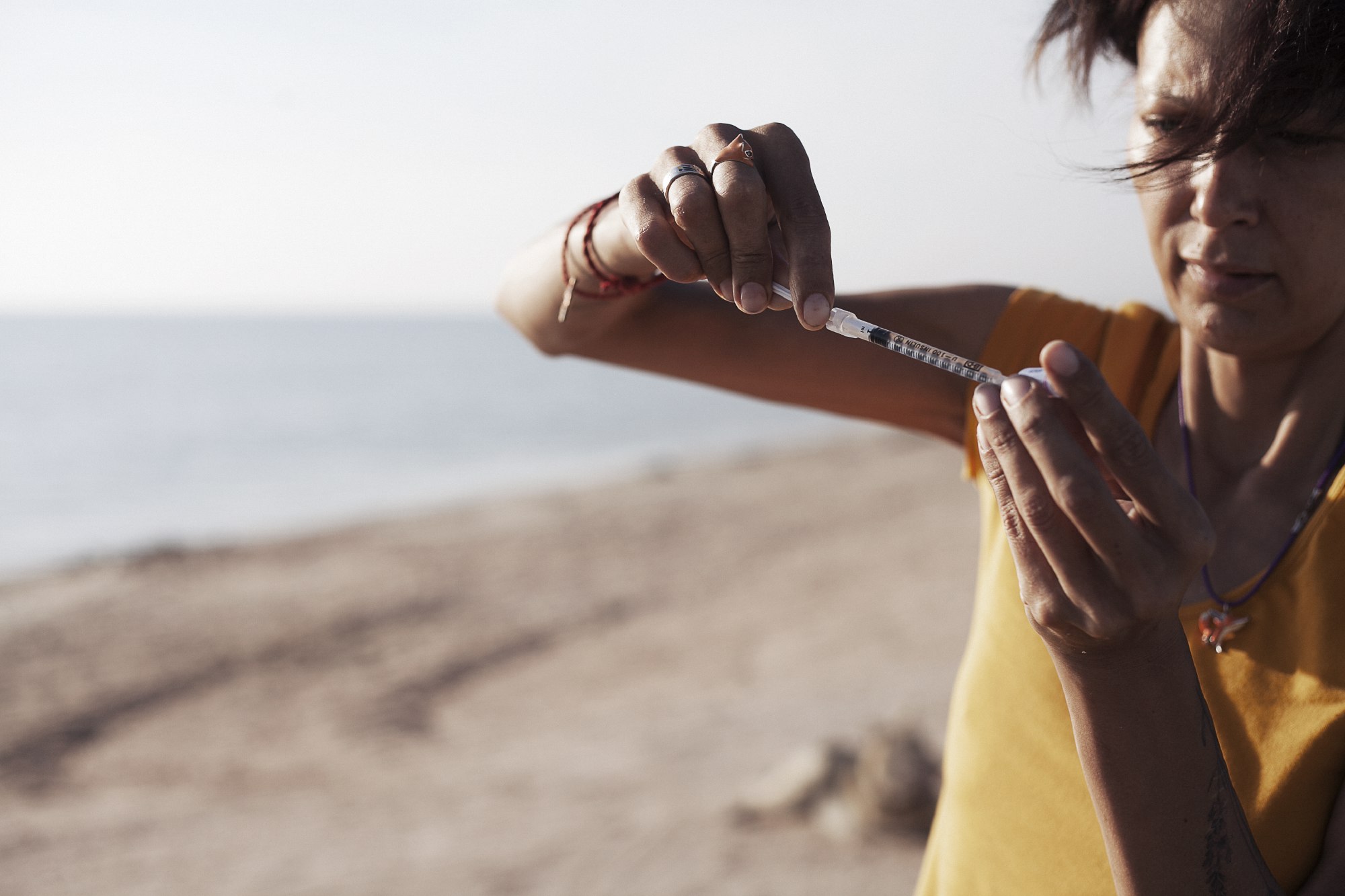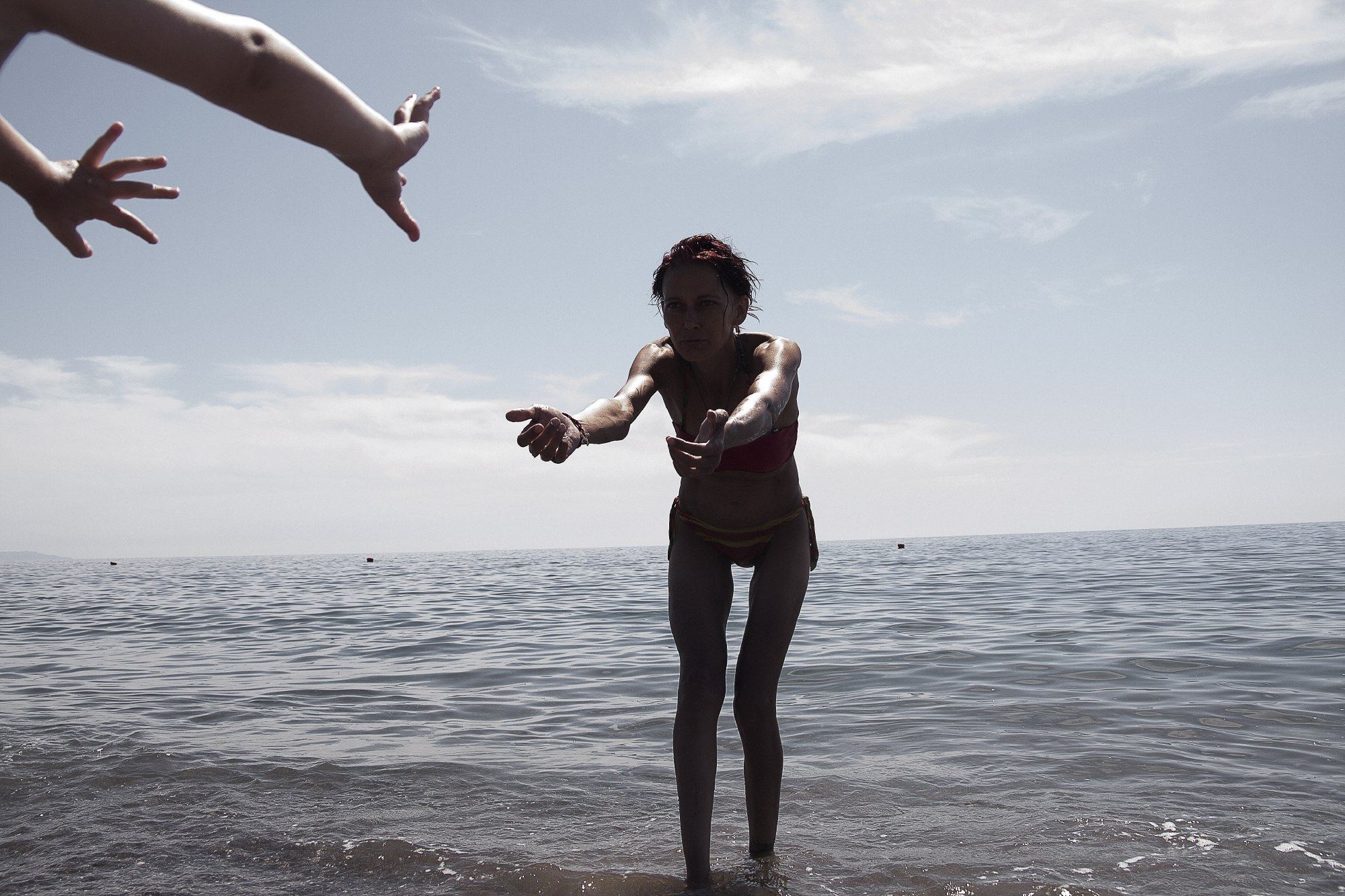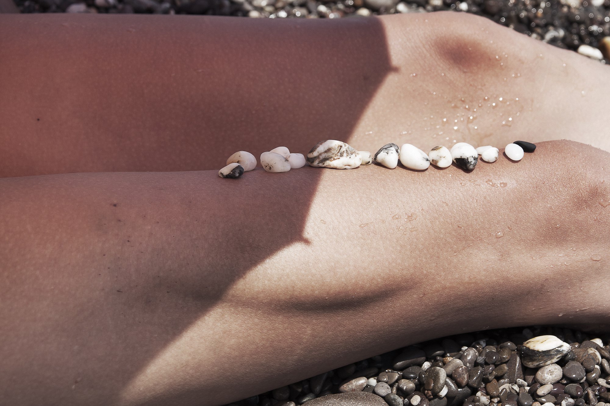 Ира перебирает камни на берегу и выкладывает ими узор на ногах. На бедре видны множественные следы от инъекций
