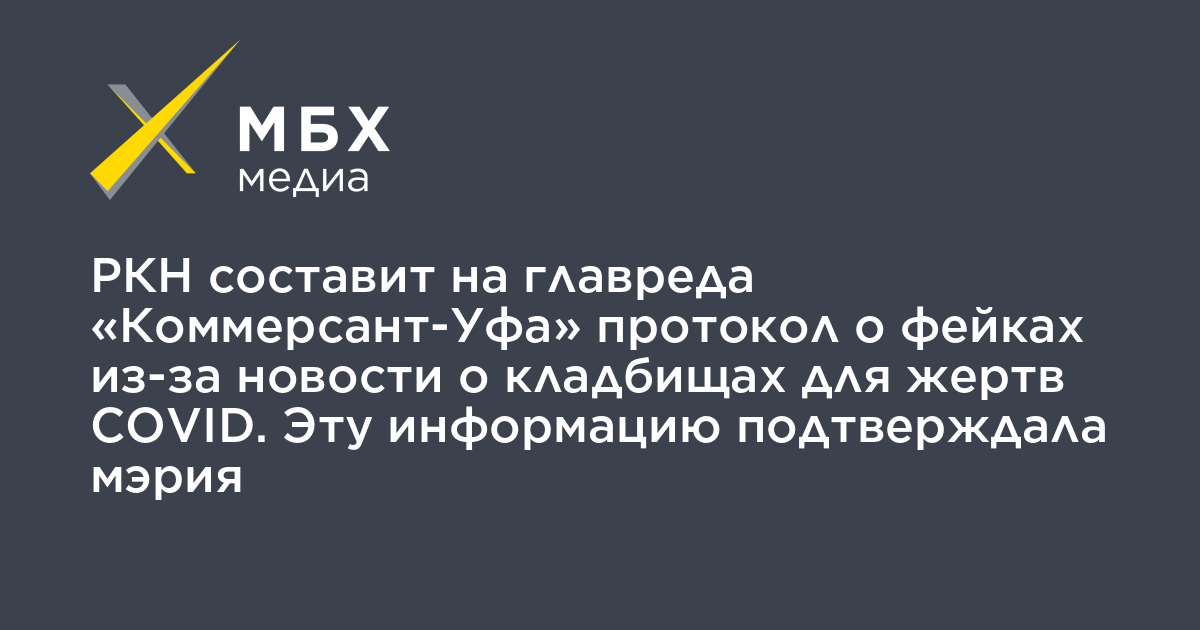 Управление Роскомнадзора по республике Башкортостан решило составить протокол о распространении фейковых новостей (часть 9 статьи 13.15 КоАП) на главного редактора издания «Коммерсант-Уфа» Наталью Павлову из-за материала о местах для умерших от коронавируса. Об этом Павлова сообщила «МБХ медиа».