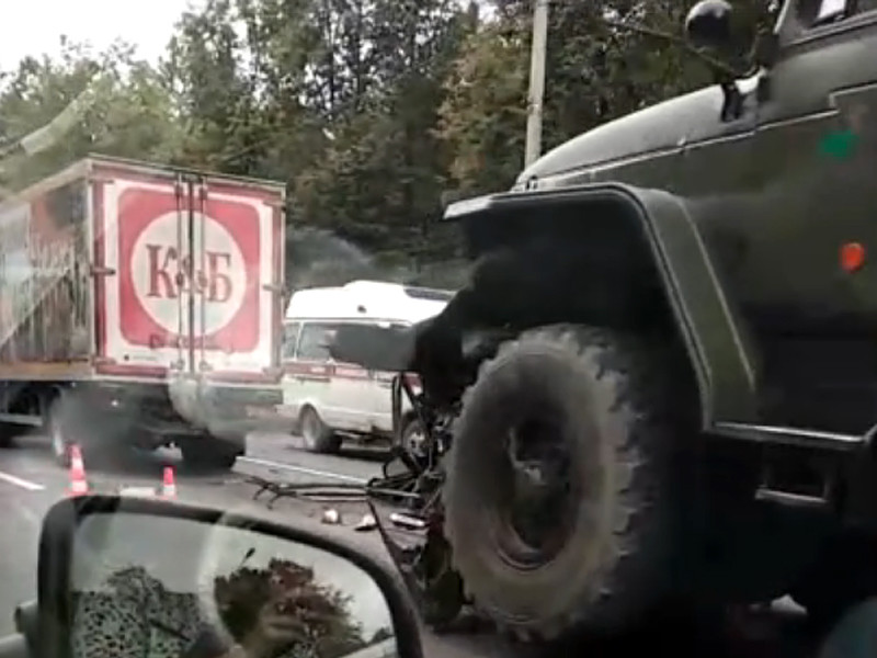 В ходе движения колонны два частных автомобиля - один из которых "Нива", обгоняя колонну на большой скорости и нарушив правила дорожного движения, вклинились "между большегрузными автомобилями, в результате чего допустили дорожно-транспортное происшествие". "Нива" была полностью смята под колесами одной из военных машин.