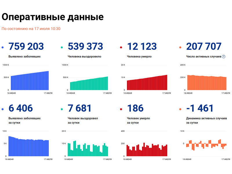 За сутки умерли 186 пациентов, общее число летальных исходов достигло 12 123. Вылечился еще 7 681 пациент, всего выздоровевших 539 373. Наибольшее число пациентов за сутки - 575 - зарегистрировано в Москве. Умерли 13 человек, выздоровели 682 пациента.
