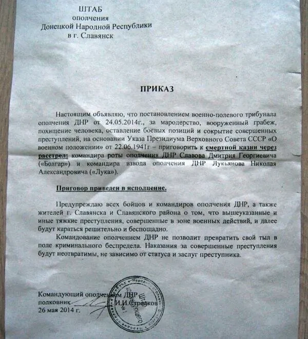 Другого способа обеспечить хоть какую-то минимальную военную законность на территории гарнизона у меня не было, и я об этом не жалею. Приказы были подписаны, четыре человека казнено и один оправдан. (…) Один местный житель — за мародерство, и трое наших бойцов — тоже за мародерство, за пытки, за похищение человека. (…) Всего казнили четверых, причем все были граждане Украины, причем даже те, кто пришли со мной из Крыма, ну и еще примерно столько же; может быть, чуть больше». (…)