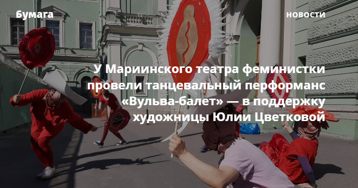 Рядом с Мариинским театром утром 17 июля феминистки провели танцевальный перформанс «Вульва-балет» в поддержку художницы Юлии Цветковой.
