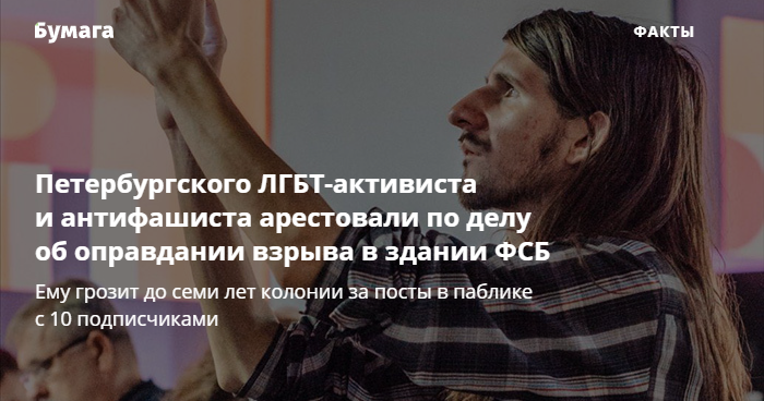 В начале июля петербургского ЛГБТ-активиста и антифашиста Александра Меркулова арестовали по делу об оправдании терроризма. По версии следствия, молодой человек опубликовал в соцсетях посты в поддержку взрыва в здании ФСБ в Архангельске. У паблика, который ведет Александр, десять подписчиков.