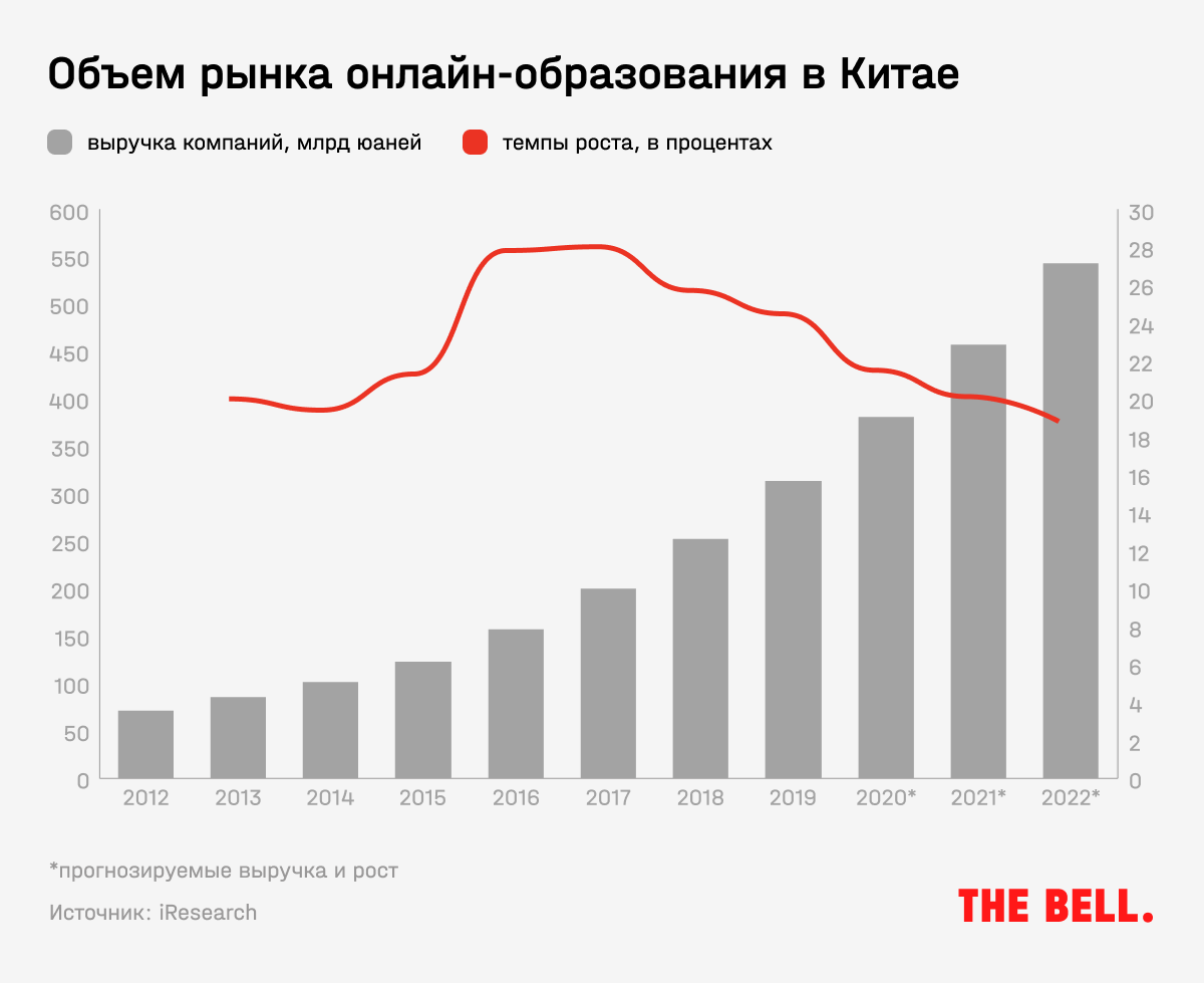 По данным китайской консалтинговой фирмы iResearch, онлайн-образование в Китае растет двузначными темпами. По ее расчетам, размер рынка составил 251,7 млрд юаней (или $37 млрд) по итогам 2018 года, а к 2022-му может увеличиться вдвое. И это еще без учета сложившейся ситуации, связанной с пандемией и вынужденным переходом многих учебных заведений в онлайн.