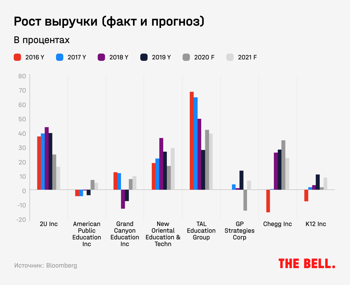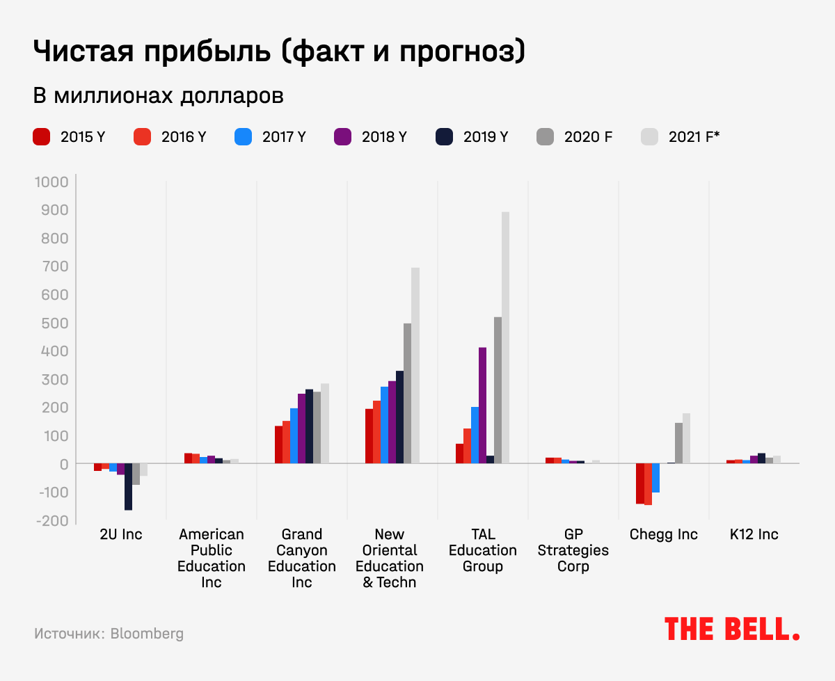- Более высокие оценки — у больших и устоявшихся компаний на своих континентах, таких как Chegg и TAL Education. У обеих хорошие прогнозы по прибыли — TAL вернется к прибыли после убытка в 2019 году, а Chegg должен выйти в прибыль впервые в 2020 году.