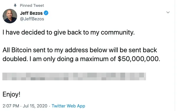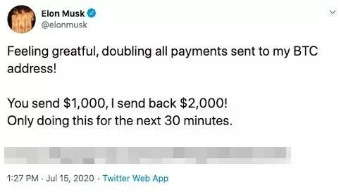 Звезды мирового масштаба обратились к своим подписчикам с такой речью: «COVID-19 побудил меня вернуть долг обществу. Все биткоины, присланные на мой адрес ниже, вернутся каждому обратно с удвоением суммы. Если вы отправите 1000 долларов, я верну 2000! Это продлится только 30 минут. Удачи!»