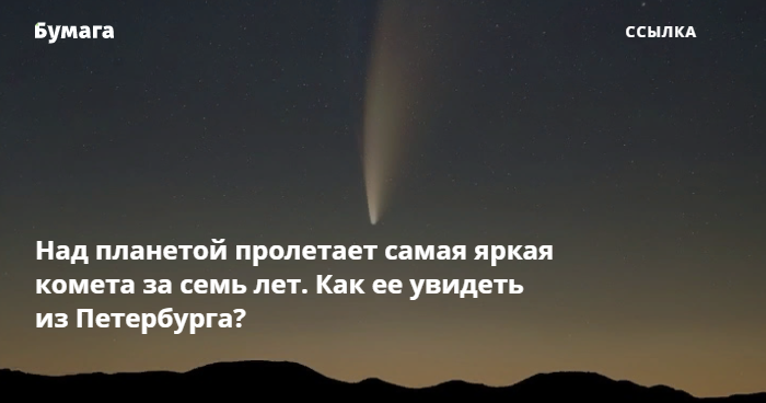Над Землей пролетает комета C/2020 F3 (NEOWISE), которую ученые называют самой яркой за последние семь лет. В сообществе наблюдательной астрономии AstroAlert рассказали, как увидеть ее из Петербурга.