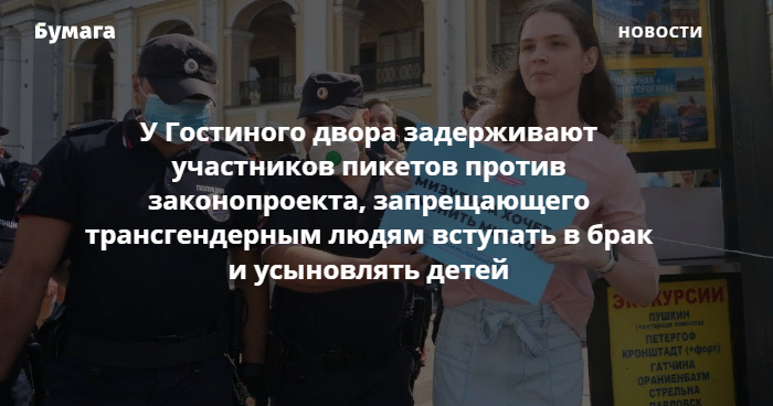 У Гостиного двора днем 18 июля началась серия пикетов против поправок к Семейному кодексу, внесенных членом Совета Федерации Еленой Мизулиной. На акции задержали десятерых активистов.
