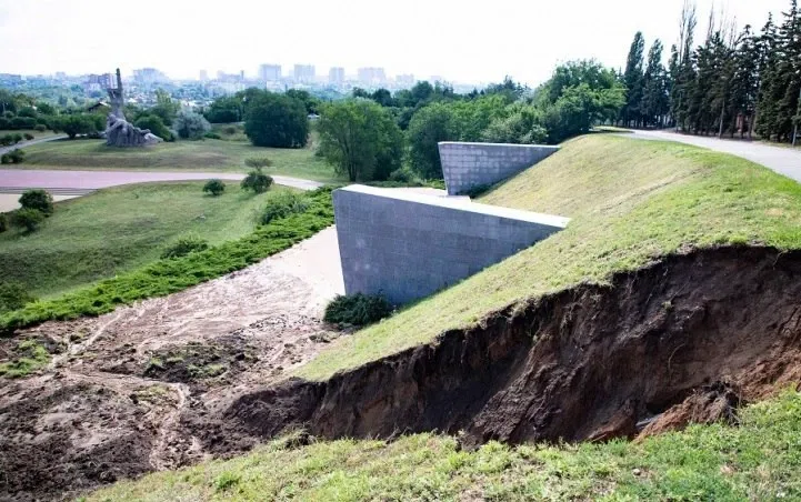 В Ростове-на-Дону после проливного дождя в Змиевской балке, самом крупном месте захоронения жертв холокоста в России, сошел оползень: дорога, идущая по верхней части мемориала, не выдержала напора воды, и участок склона между мраморными пилонами смыло в балку.