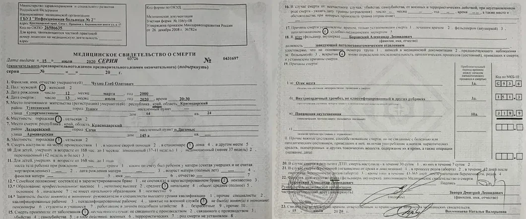 — Нам позвонили в ночь на 14, и утром мы уже были в пятой инфекционной больнице в Дагомысе. Хотели увидеть тело сына — нам отказали. Причины не объяснили. Потом поехали в его часть. С нами разговаривал командир роты. Рассказал, что сын несколько дней лежал в санчасти, а в понедельник ему стало сильно хуже. Его повезли в поликлинику при части, сделали компьютерную томографию, которая показала двустороннюю пневмонию. Оттуда сразу направили в инфекционную больницу, подключили к аппарату ИВЛ. Первое вскрытие показало вот это — отек мозга, тромбоз и непонятная пневмония. 16 июля было повторное вскрытие, его результатов мы пока не знаем, — говорит Ольга Чухно.