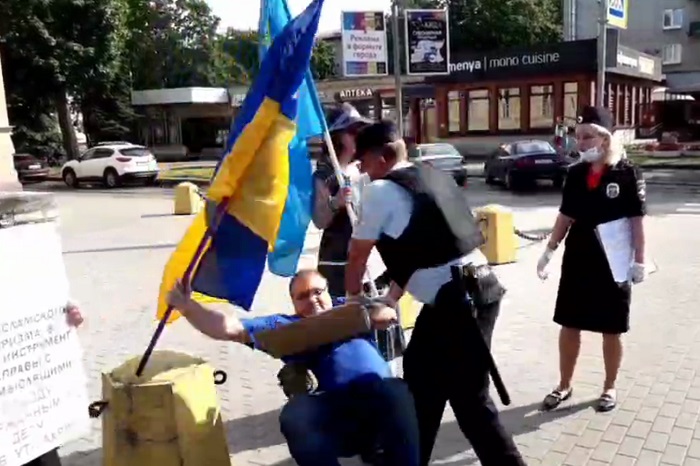 Этот момент попал на видео. На записи видно, как Шипицин падает во время задержания и флагом задевает полицейского по голове, сбивая с него кепку. Затем на активиста надевают наручники и уводят в автозак.
