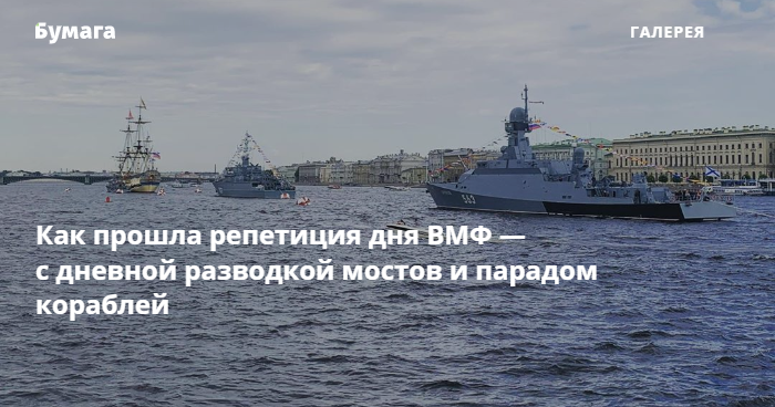 В Петербурге 19 июля прошла первая репетиция парада в честь Дня Военно-морского флота. Из-за этого в городе днем разводили мосты: корабли прошли под Благовещенским, Дворцовым, Троицким и Литейным. Еще одна репетиция состоится 23 июля, а сам праздник — 26 июля.