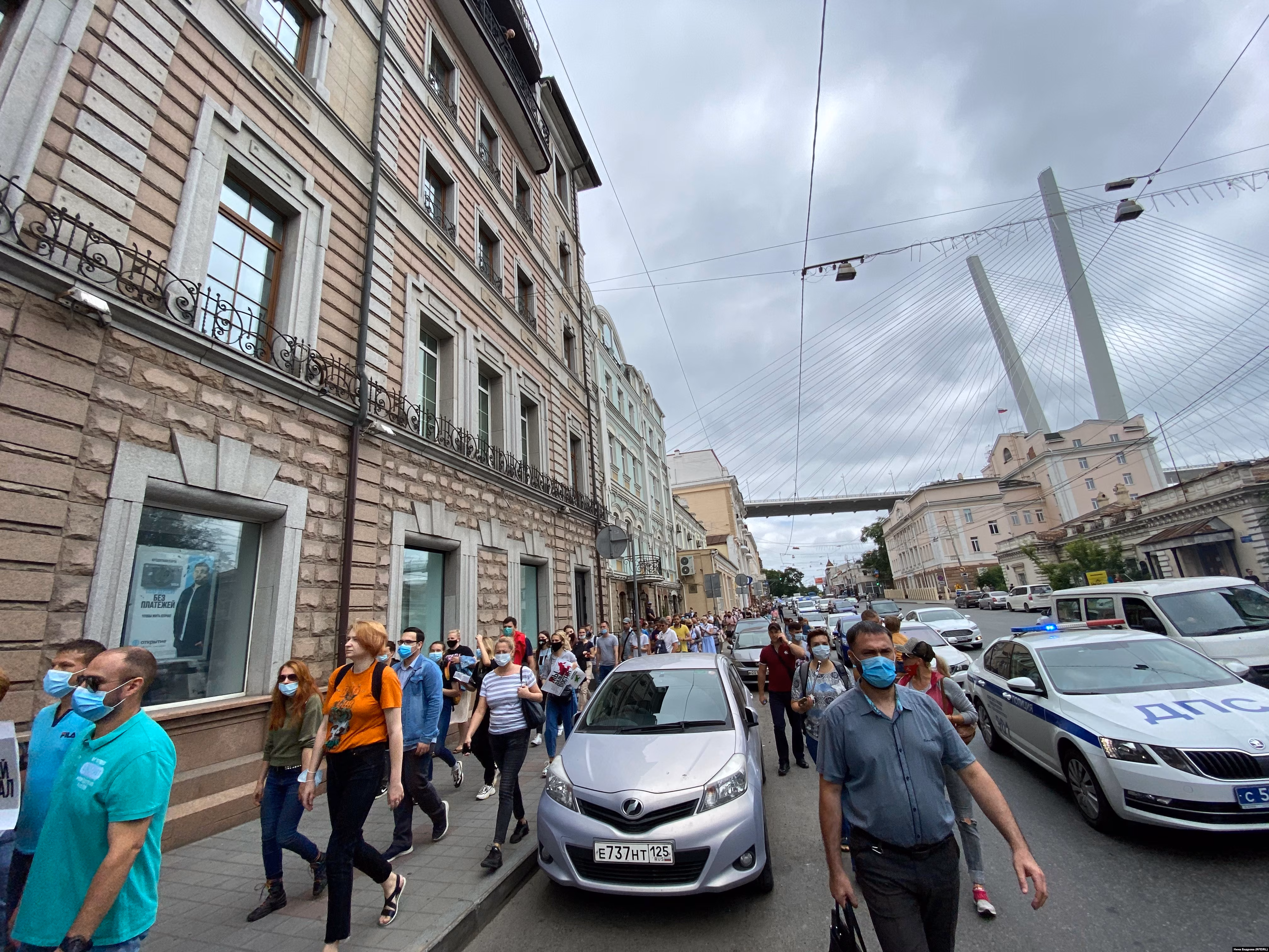Несогласованная акция в поддержку арестованного губернатора Хабаровска прошла в воскресенье во Владивостоке. К памятнику борцам за власть Советов пришло около 100 человек. В соцсетях распространялись призывы прийти к памятнику "кормить голубей". Власти сообщили, что в воскресенье будут "отмывать памятник от экскрементов голубей, которых кормят неравнодушные горожане". Памятник действительно был оцеплен и во время акции протеста проводилась его дезинфекция. Участники акции протеста также провели шествие по центру Владивостока.