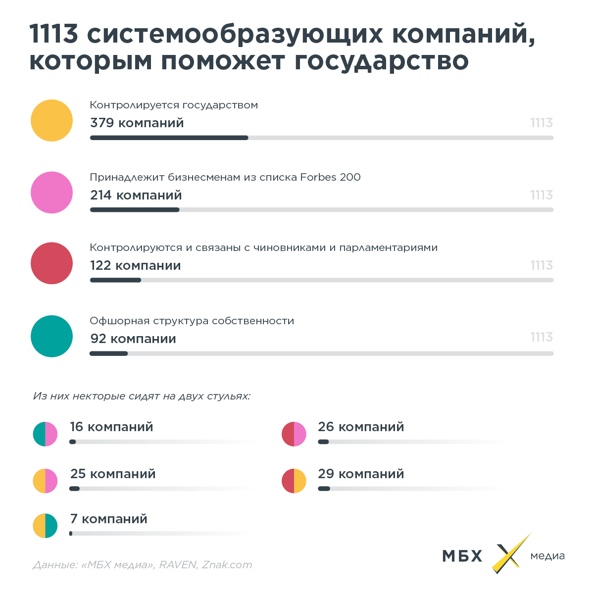 С началом экономического кризиса, вызванного коронавирусом, государство решило помочь «системообразующим компаниям». Для этого был создан специальный список. «МБХ медиа», RAVEN и Znak.com изучили больше тысячи предприятий, попавших в него, и выяснили, что структура собственности многих из них непрозрачна: они или оформлены в офшорах, или у них скрыты владельцы. Кроме того мы подсчитали, сколько компаний связаны с чиновниками и парламентариями. Кстати, руководители некоторых организаций уже пожалели, что оказались в этом списке.