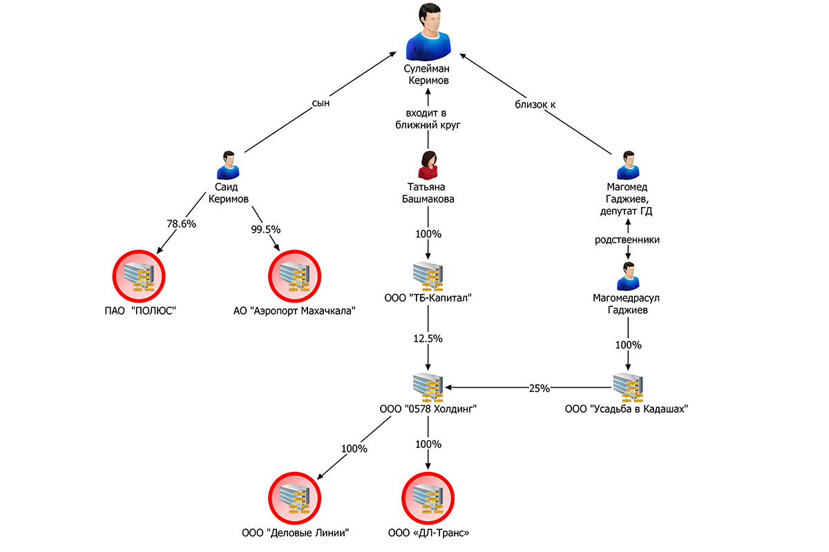 Помимо этого Керимов через Татьяну Башмакову связан с еще двумя компаниями из списка: «Деловые линии» и «ДЛ-Транс». Как писал Forbes, она из в ближнего круга Керимова. Башмакова возглавляла компанию «Нафта Москва» Керимова, в 2017 году от сына Керимова к ней во владение перешла компания «Эйр-Синема». По данным «СПАРК-Интерфакс», Башмакова через компанию «ТБ-Капитал» владеет 12,5% компании «0578 холдинг», которому принадлежат «Деловые линии» и «ДЛ-Транс». Также 25% акций «0578 холдинг» владеет Магомедрасул Гаджиев через компанию «Усадьба в Кадашах». Он считается родственником депутата Госдумы из Дагестана Магомеда Гаджиева, тоже близкого к Керимову.