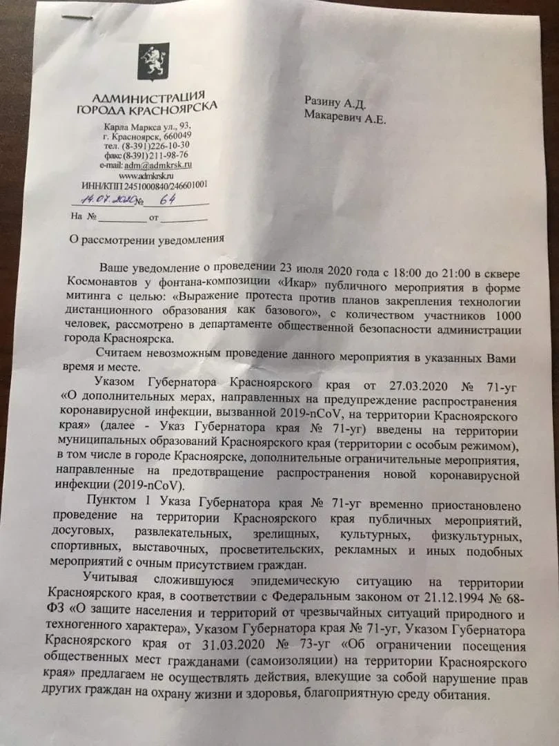 Мэрия Красноярска отказала старшекласснику Александру Разину в проведении митинга против некачественного дистанционного обучения, после чего школьник решил подать на мэрию в суд. Тайга.инфо поговорила со школьником об уроках у компьютера, протестах и давлении со стороны властей. Материал публикуется в рамках журналистского объединения «Синдикат-100».