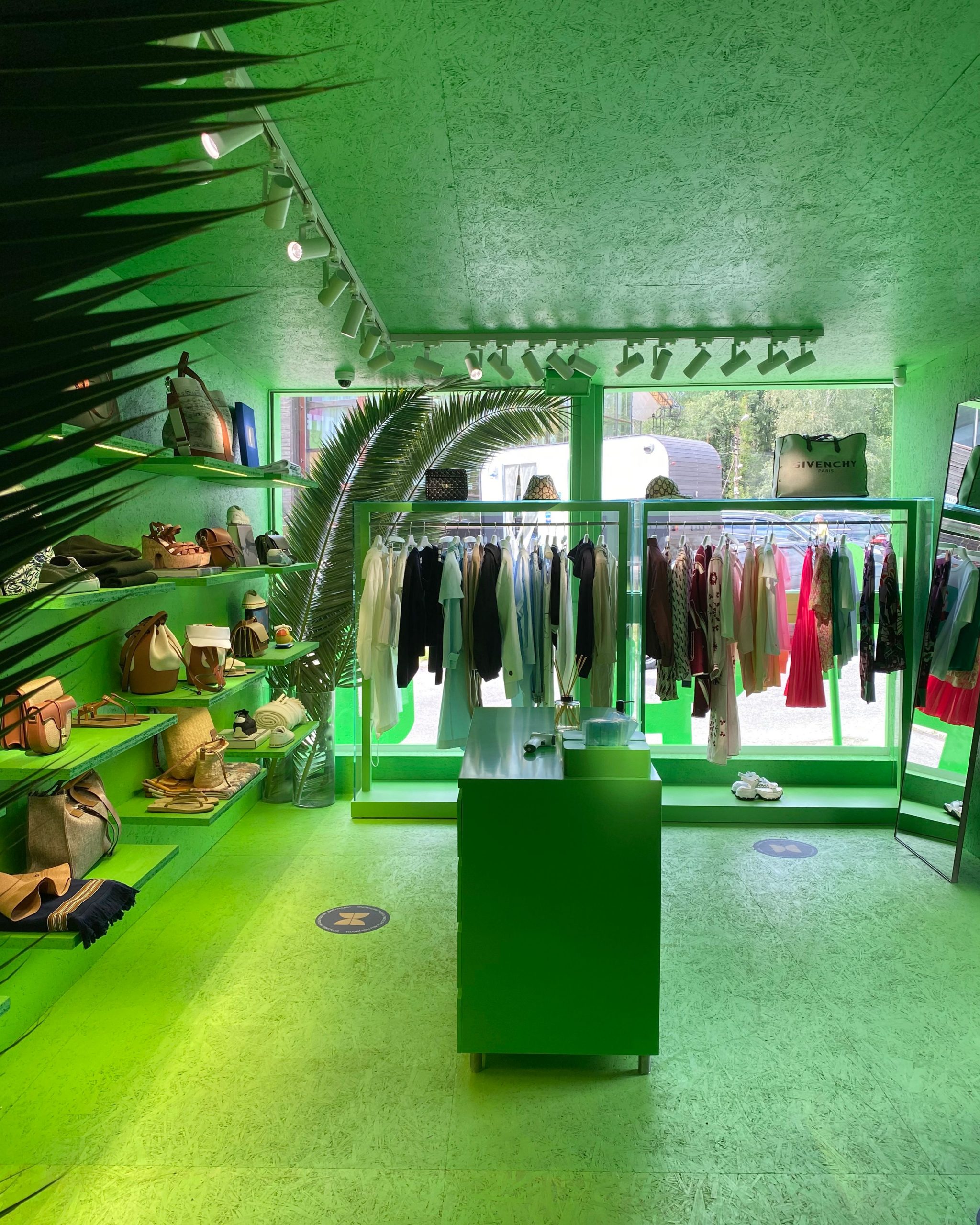 В бутике за городом представлены капсульные коллекции модных брендов — от Valentino и Miu Miu до Stella McCartney, Givenchy и Gucci. В магазине есть экраны, с помощью которых можно ознакомиться с полным ассортиментом всех бутиков и сделать заказ в интернет-магазине.