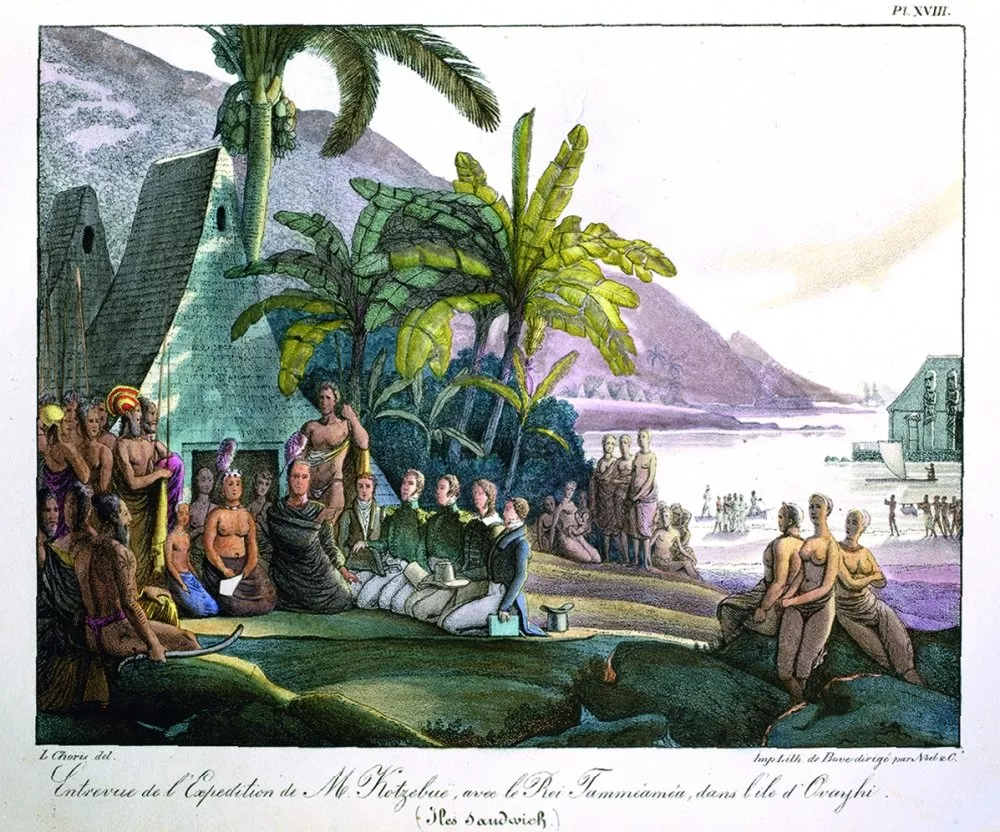 Участники экспедиции лейтенанта Коцебу на встрече с королем Гавайев Камеамеа I. Справа от короля (сидят): доктор Эшшольц, лейтенант Коцебу, лейтенант Шишмарев, натуралист и писатель фон Шамиссо, художник Хорис. Литография Ноэля, раскрашенная акварелью, по оригиналу Л. Хориса. 1826 год.