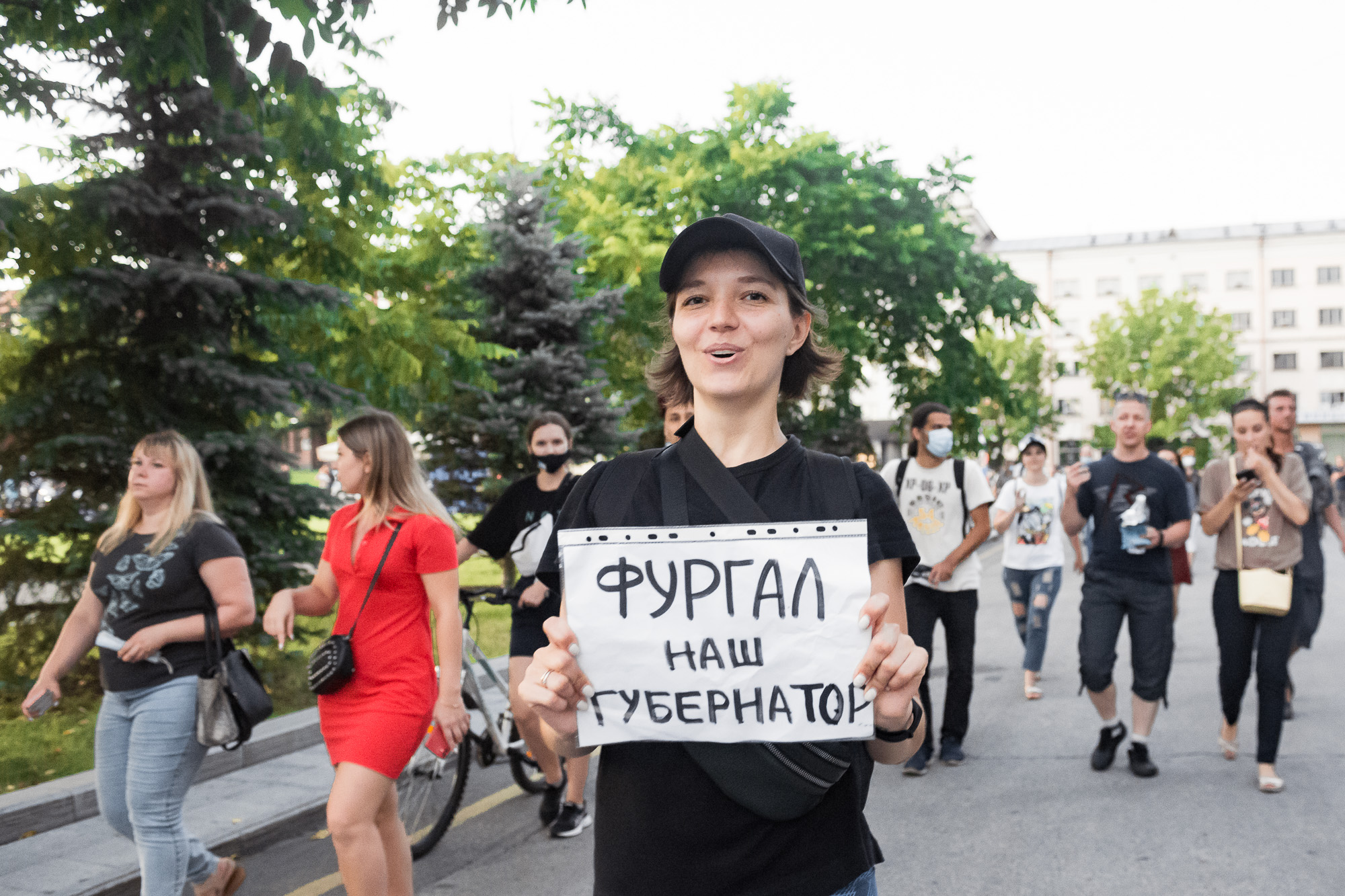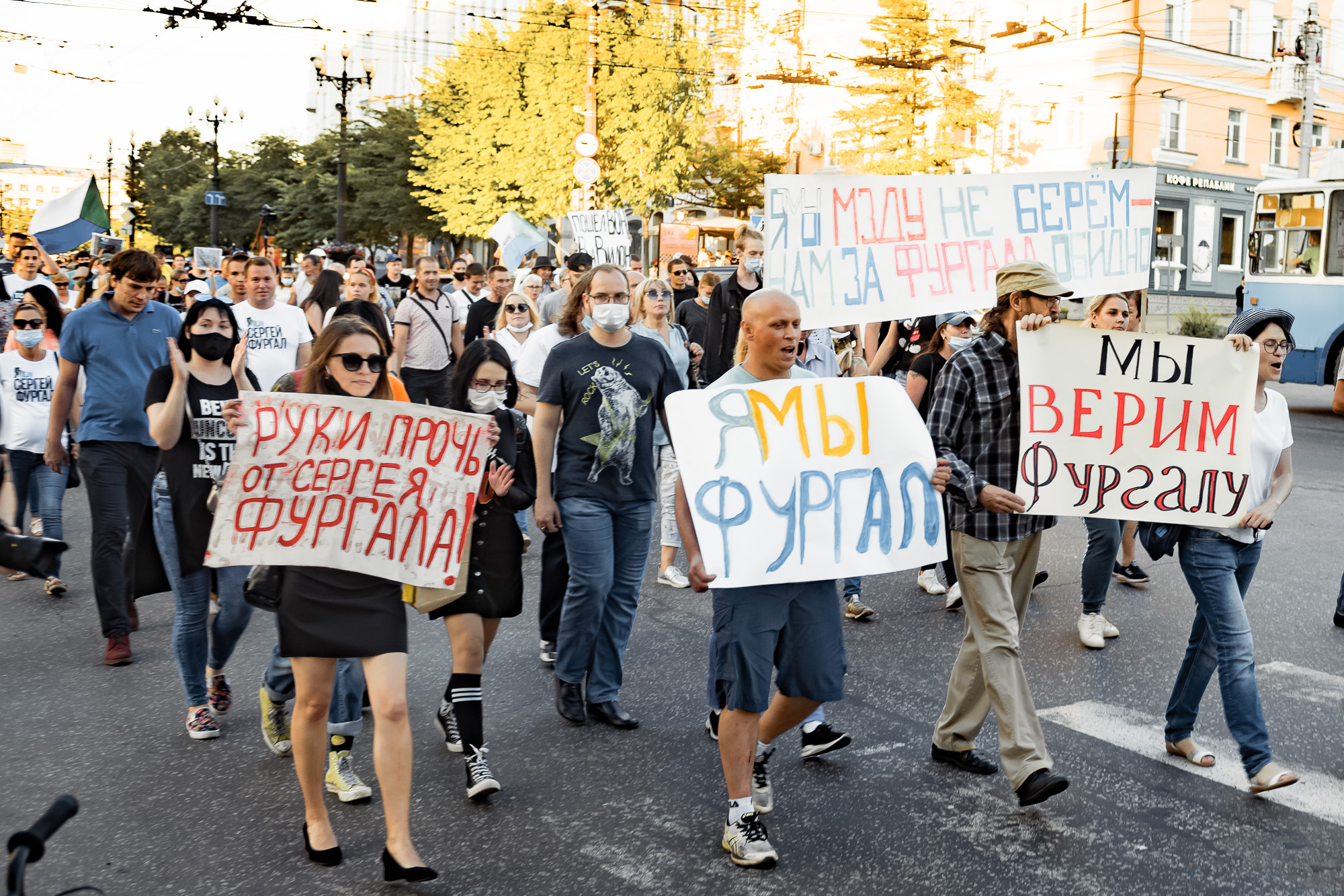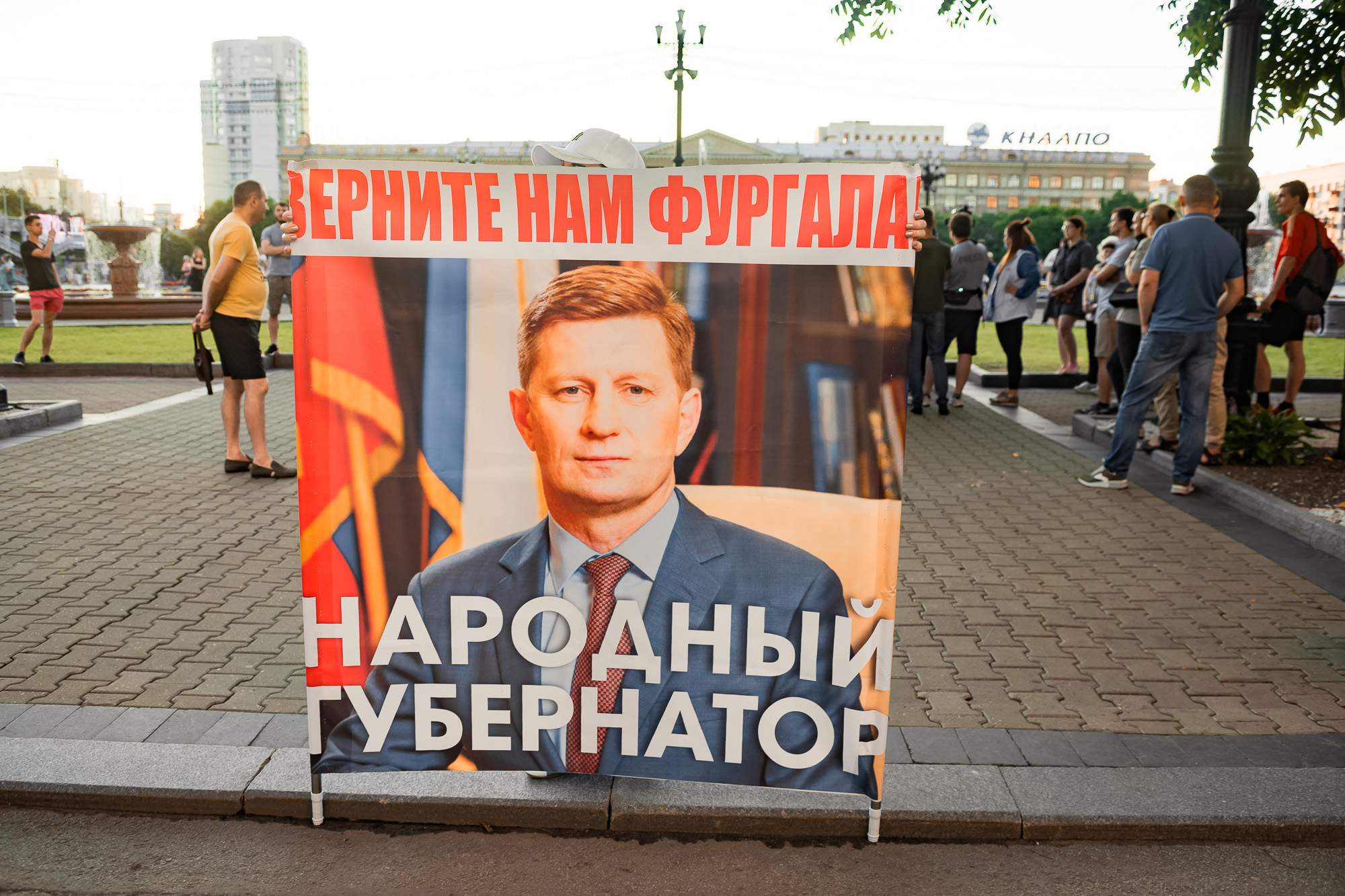 – У меня другого руководства нет. Пусть вернут нам Сергея Ивановича, пусть он продолжает работать. Я за него не голосовал, сто лет на выборы не хожу. Но сейчас я вышел за него, и буду выходить за него, – говорит Артем Демченко, он несет плакат "Я/Мы Фургал". – А Фургал как кость в горле застрял у Москвы. У него же рейтинг выше, чем у Путина. Он много работал, посрезал чиновникам зарплату, накрыл коррупционные схемы. А то, что он бизнесмен, – да все это знают. Каких-то бизнесменов он якобы убил? Да в 2004 году бандиты только были, а не бизнесмены, и я ему верю, что он не убивал никого. Про нового, Дегтярева, толком не знаю ничего. Но слышал что-то, мол, он нас дубинками будет разгонять. Ага, посмотрю я, как он будет нас разгонять. Мне кажется, ему уже чемодан обратно пора собирать.