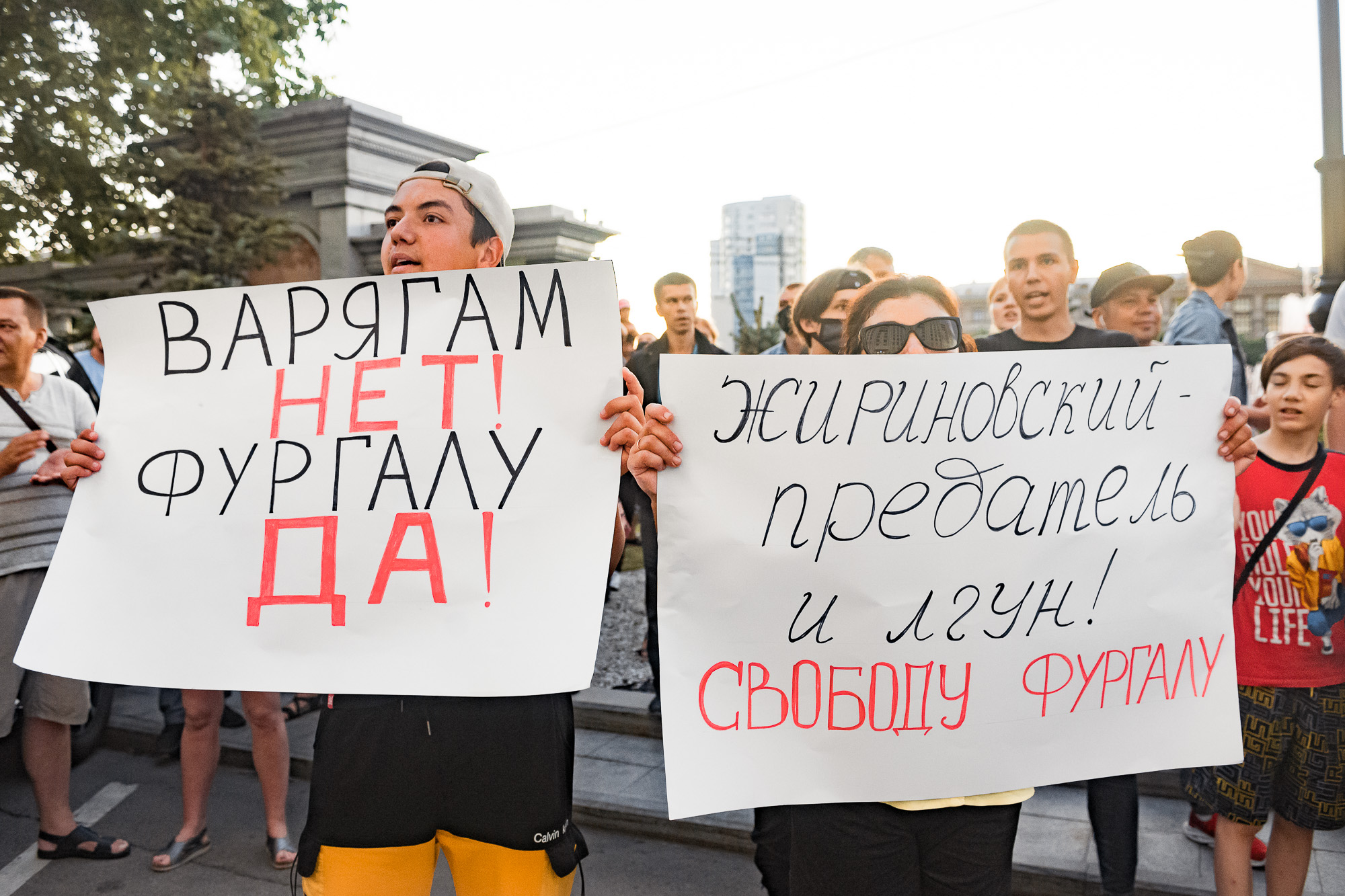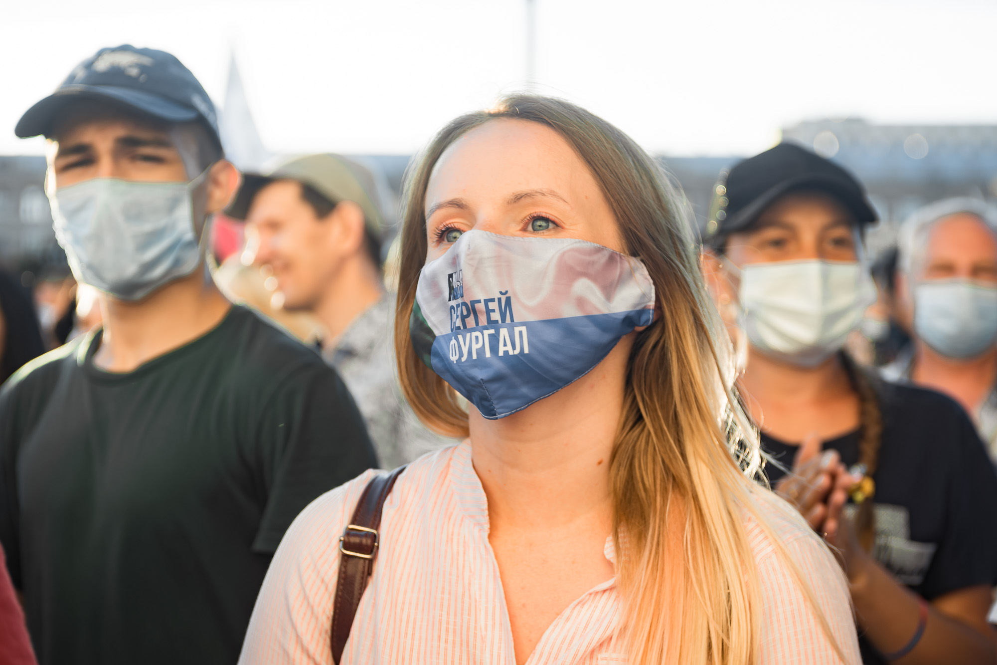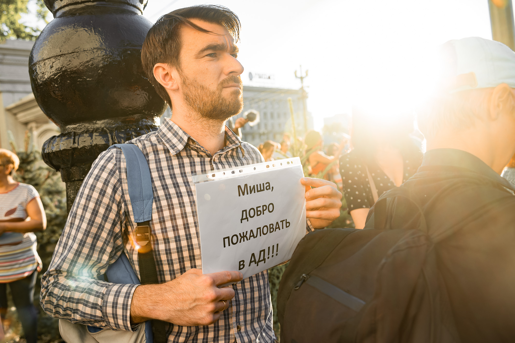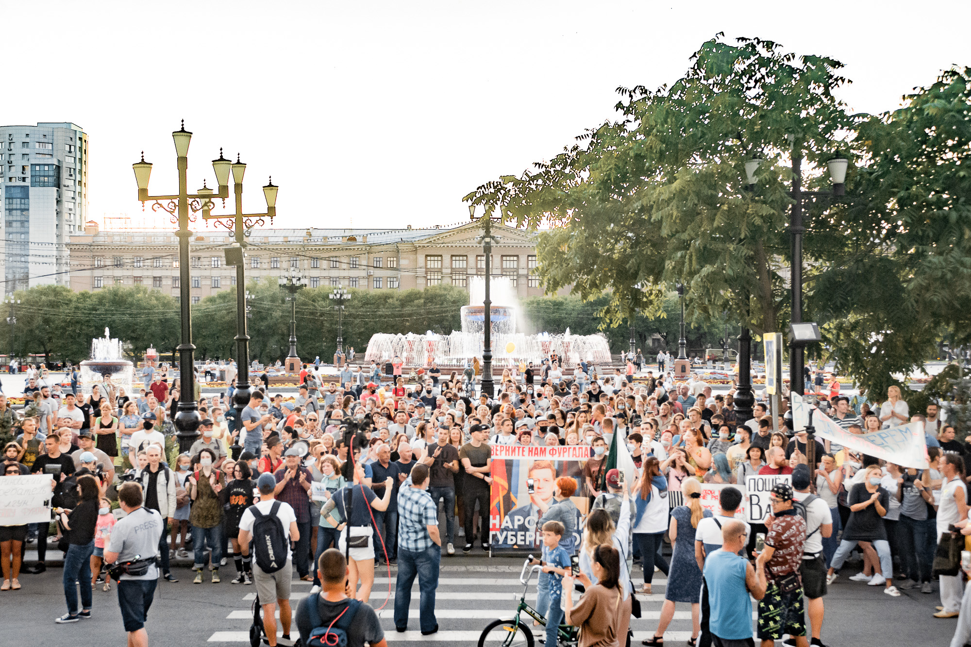 – У меня другого руководства нет. Пусть вернут нам Сергея Ивановича, пусть он продолжает работать. Я за него не голосовал, сто лет на выборы не хожу. Но сейчас я вышел за него, и буду выходить за него, – говорит Артем Демченко, он несет плакат "Я/Мы Фургал". – А Фургал как кость в горле застрял у Москвы. У него же рейтинг выше, чем у Путина. Он много работал, посрезал чиновникам зарплату, накрыл коррупционные схемы. А то, что он бизнесмен, – да все это знают. Каких-то бизнесменов он якобы убил? Да в 2004 году бандиты только были, а не бизнесмены, и я ему верю, что он не убивал никого. Про нового, Дегтярева, толком не знаю ничего. Но слышал что-то, мол, он нас дубинками будет разгонять. Ага, посмотрю я, как он будет нас разгонять. Мне кажется, ему уже чемодан обратно пора собирать.
